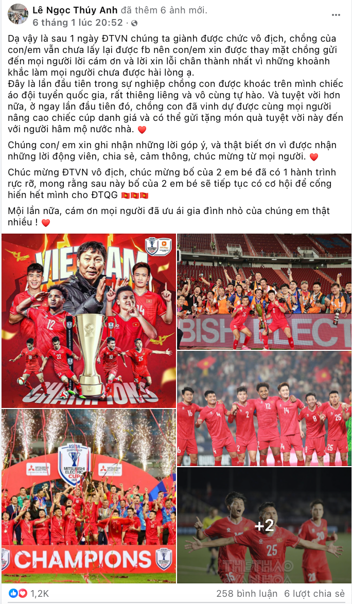 "Dạ vậy là sau 1 ngày ĐT Việt Nam chúng ta giành được chức vô địch, chồng của con/em vẫn chưa lấy lại được Facebook nên con/em xin được thay mặt chồng gửi đến mọi người lời cám ơn và lời xin lỗi chân thành nhất vì những khoảnh khắc làm mọi người chưa được hài lòng ạ.