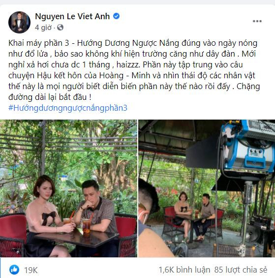Cụ thể, trên trang cá nhân, anh viết: “Khai máy phần 3 - Hướng Dương Ngược Nắng đúng vào ngày nóng như đổ lửa, bảo sao không khí hiện trường căng như dây đàn . Mới nghỉ xả hơi chưa dc 1 tháng.”