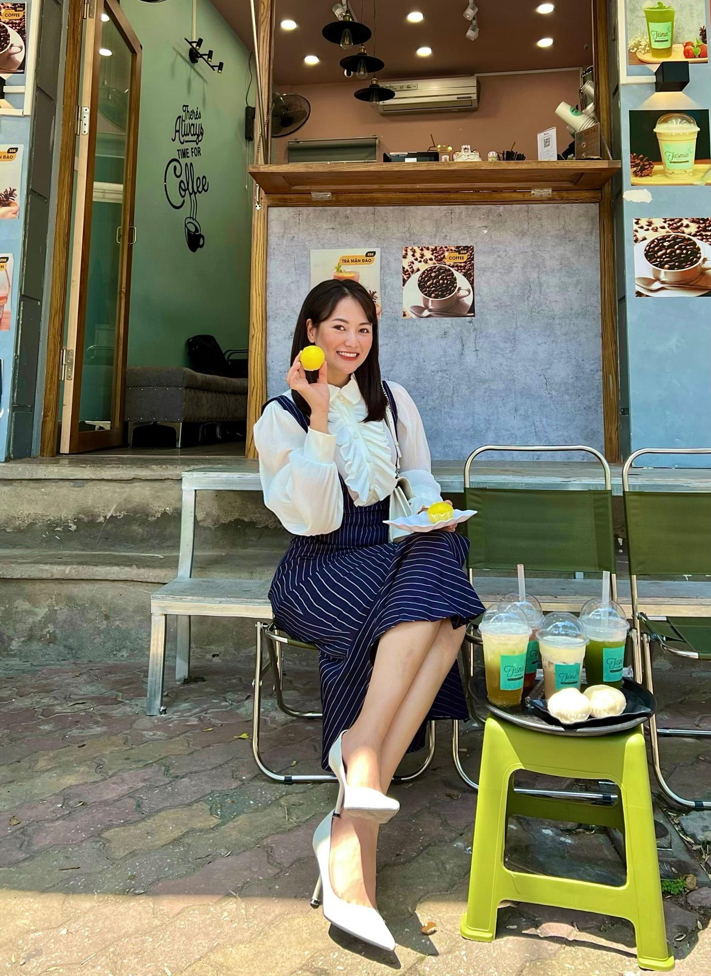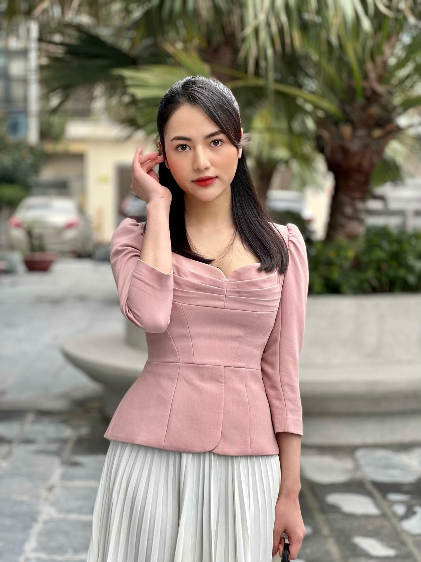 Việt Hoa rất thích những mẫu áo blouse điệu đà với nhiều điểm nhấn như tay bồng, cổ thắt nơ to hoặc cổ bản lớn thêu hoa như thế này. Trang phục đủ lịch sự ở chốn công sở mà vẫn đủ trẻ trung để đi chơi, đi hẹn hò.