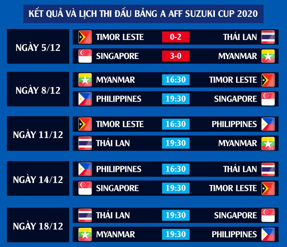 AFF Cup 2020 đã kết thúc lượt đấu đầu tiên với 4 trận đấu ở 2 bảng. Tại bảng A, Thái Lan thắng Timor Leste 2-0, chủ nhà Singapore đánh bại Myanmar 3-0. Tại bảng B, Malaysia vượt qua Campuchia 3-1 và Việt Nam thắng Lào 2-0.
