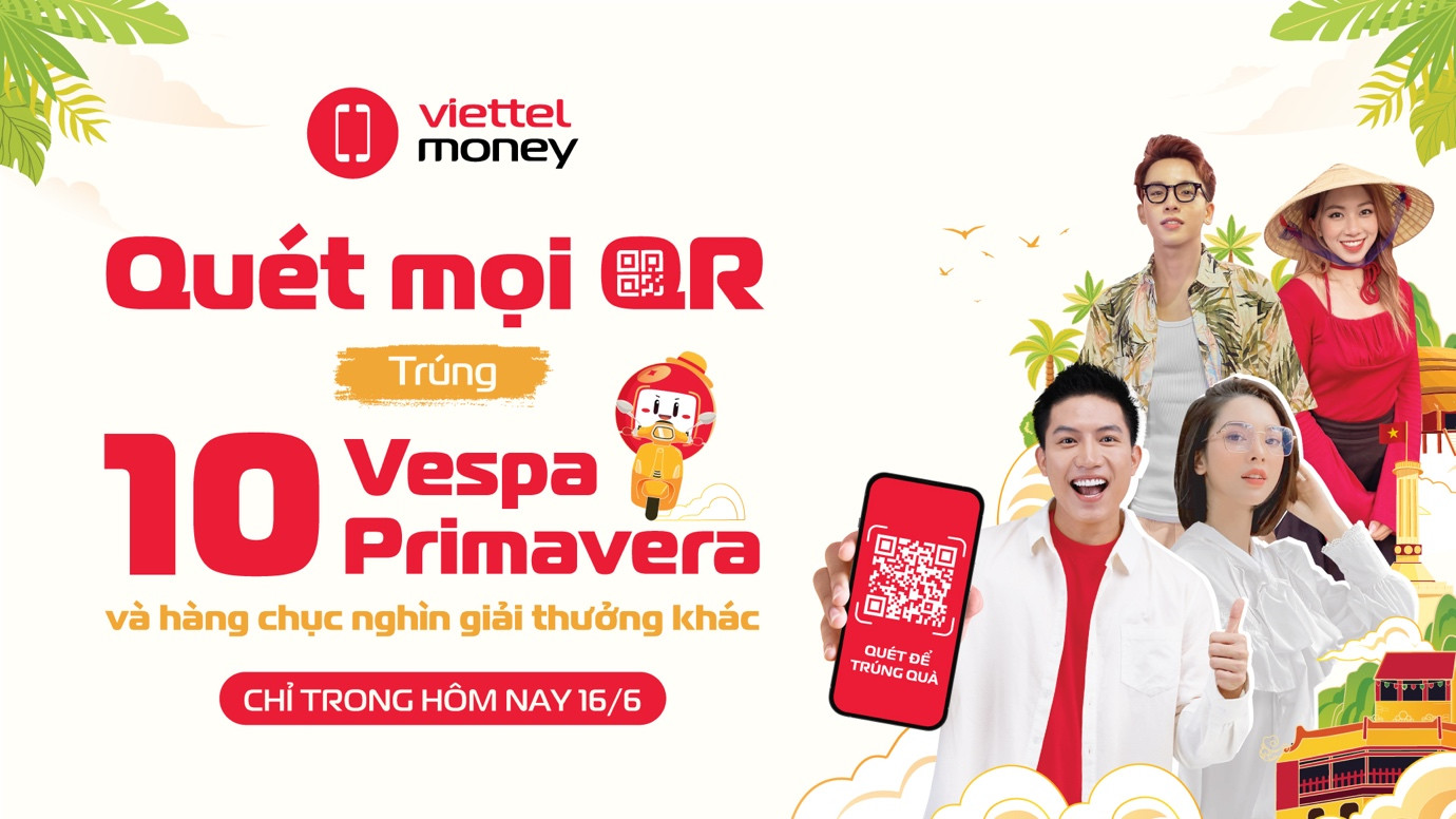 Toàn bộ khách hàng của Viettel Money chỉ cần thực hiện thanh toán bằng QR với Viettel Money có giá trị giao dịch tối thiểu 20.000đ sẽ sở hữu cơ hội tham gia quay số trúng thưởng hàng tuần xe máy Vespa Primavera trị giá 80.000.000đ cùng hàng chục nghìn voucher dịch vụ trị giá từ 5.000đ - 100.000đ.