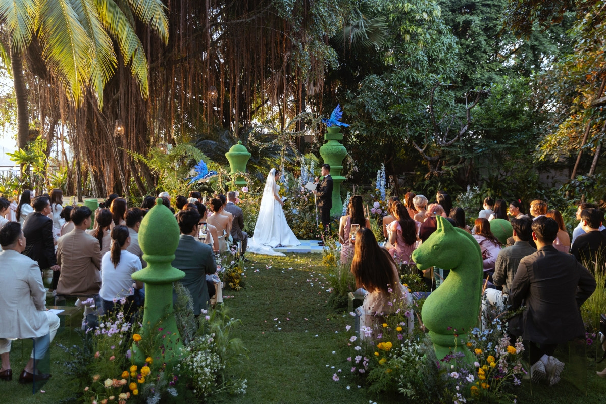 Điểm nhấn đặc biệt là khu vườn được bài trí như một bàn cờ vua khổng lồ, với hai quân cờ vua và hậu đại diện cho cô dâu và chú rể. Hình ảnh đôi chim cũng được khéo léo lồng ghép, biểu tượng cho hai cánh chim từ phương Bắc và phương Nam gặp nhau, yêu thương và xây dựng hạnh phúc bên nhau.