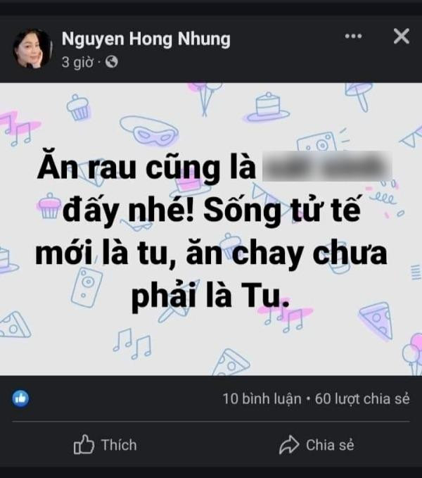 Những tưởng sau các ồn ào này, vợ của NSƯT Xuân Bắc sẽ hạn chế các phát ngôn có phần nhạy cảm thì cô lại vừa chia sẻ quan điểm: "Ăn rau cũng là sát sinh. Sống tử tế mới là tu, ăn chay chưa phải là tu". Khi trò chuyện phía dưới với bạn bè, cô cũng khẳng định đã thấy nhiều người ăn chay mà sống ác.