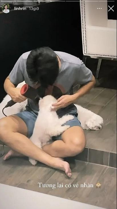Mới đây, Linh Rin đã đăng tải bức hình Phillip Nguyễn đang sấy khô lông cho chú cún cưng của cô, kèm theo tâm sự: “Tương lai có vẻ nhàn”. Hẳn Linh Rin đang ngầm khoe khéo rằng có người chồng sắp cưới chăm chỉ làm mọi việc như thế này, cô sẽ không phải động chân động tay nhiều sau khi kết hôn.