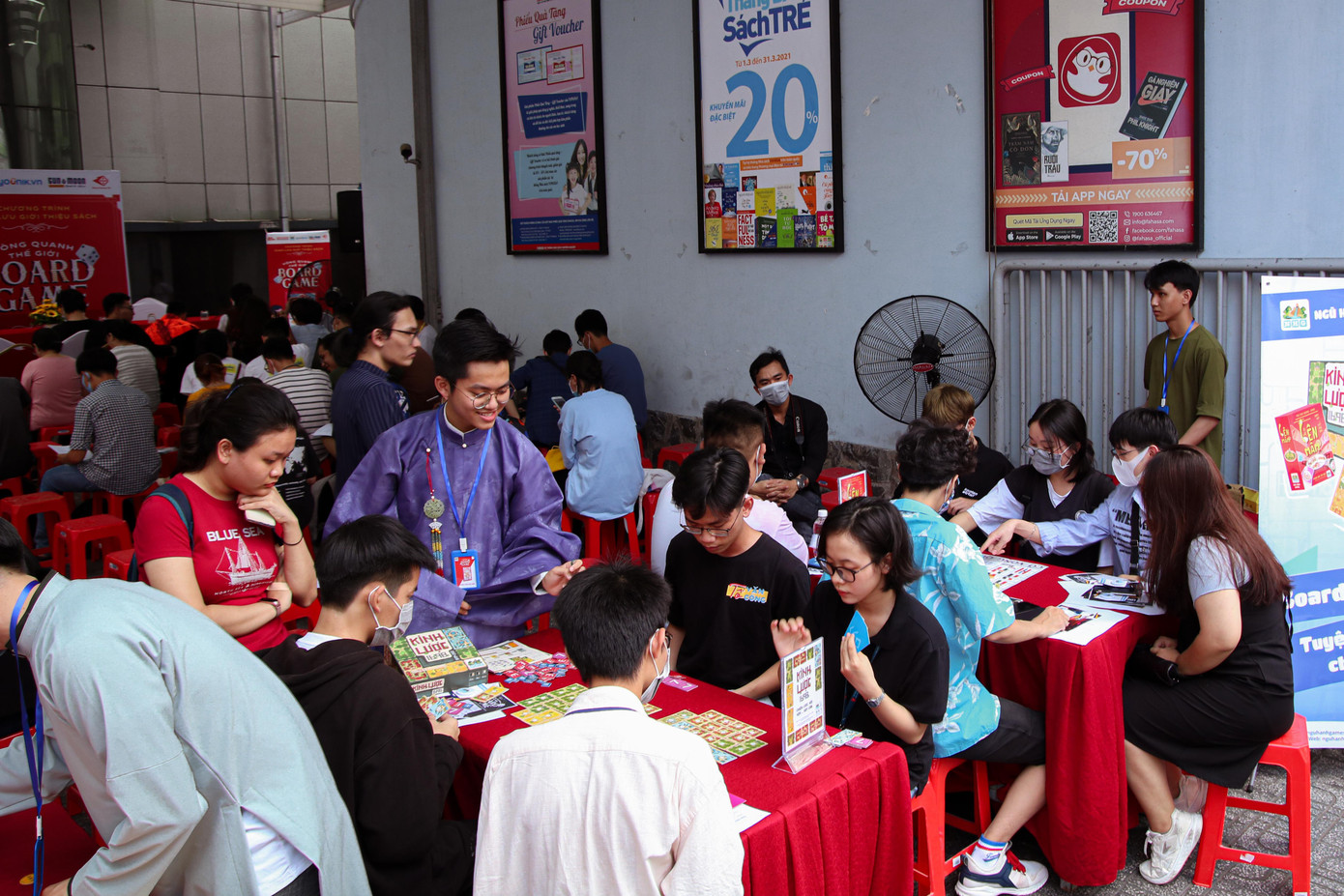 Ngay sau đó, các bạn được hướng dẫn đến dãy bàn game với những bạn hướng dẫn chơi mặc áo dài cực đáng yêu, sẵn sàng hỗ trợ bất kỳ ai muốn thử sức với các bộ board game mang đậm văn hóa Việt Nam như bộ Lên Mâm, Hội Phố, Kinh Lược, hay các game trong cuốn sách Vòng quanh thế giới board game.