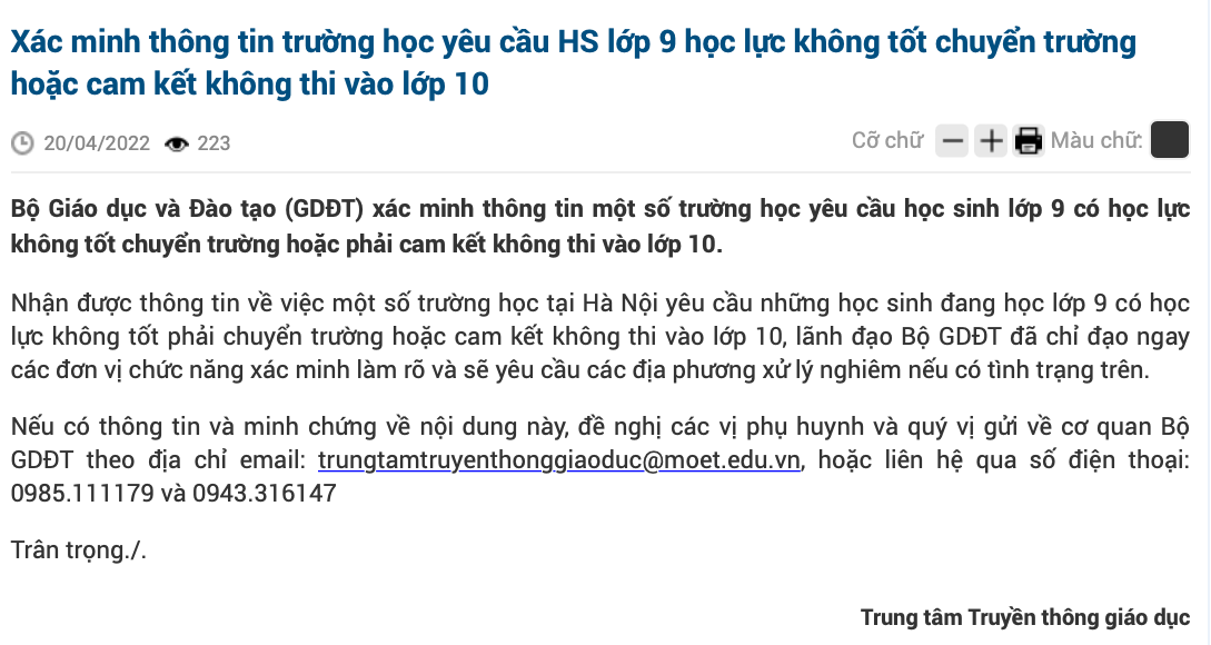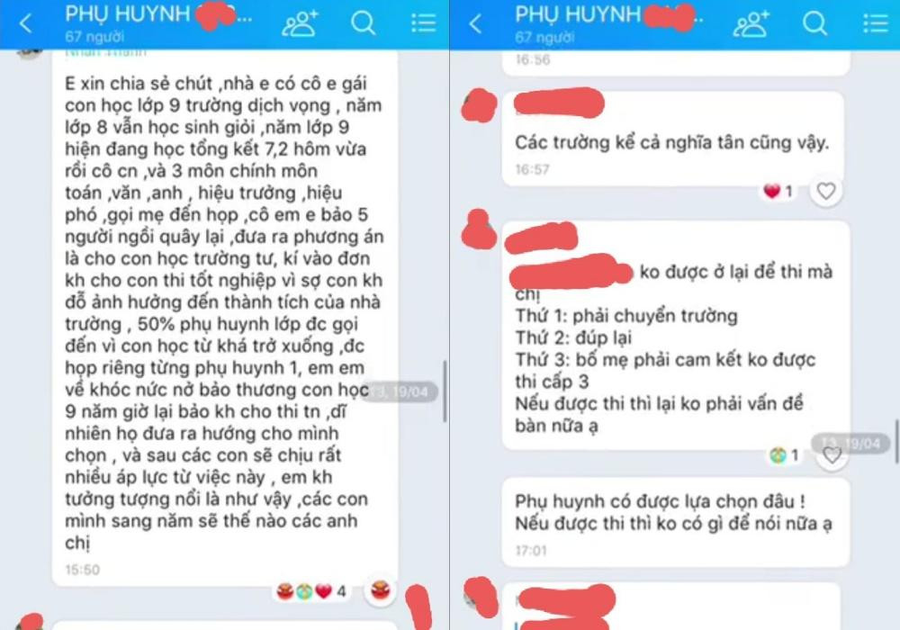 Trước đó, trên mạng xã hội lan truyền thông tin về việc một phụ huynh chia sẻ vấn đề trong nhóm cha mẹ học sinh có con đang học ở Hà Nội. Cụ thể, nhà trường yêu cầu những học sinh đang học lớp 9 có học lực không tốt phải chuyển trường (về các trường tư) hoặc làm cam kết không thi vào lớp 10 THPT. Đoạn chat giữa các phụ huynh này được chụp lại và đăng tải lên mạng xã hội khiến dư luận tỏ ra khá bức xúc dù thực hư câu chuyện này chưa được kiểm chứng.