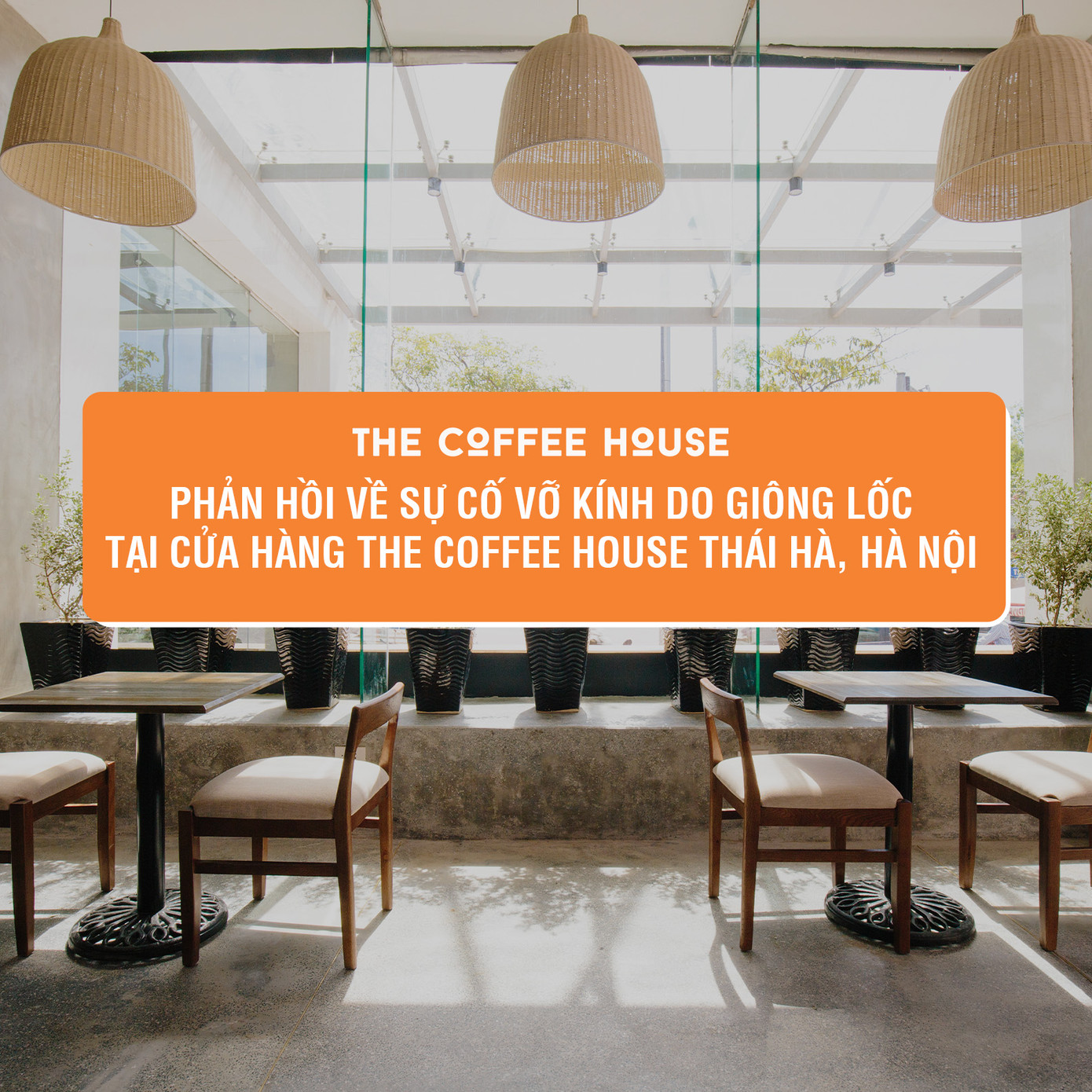 "Vào tối ngày 20/4/2024, Hà Nội có xuất hiện giông lốc kèm mưa đá, gây vỡ kính tại toà nhà Việt Tower - 01 Thái Hà, nơi The Coffee House (TCH) thuê mở địa điểm kinh doanh. Sự cố thiên tai này đã khiến một số khách hàng và nhân viên bị thương ở các mức độ khác nhau. Ngay khi sự cố xảy ra, TCH đã ngay lập tức đưa người bị thương vào viện chữa trị. Đồng thời tích cực phối hợp với các cơ quan chức năng và BQL tòa nhà Việt Tower (bên cho thuê và vận hành tòa nhà) xác định thiệt hại và đề xuất phương án hỗ trợ.