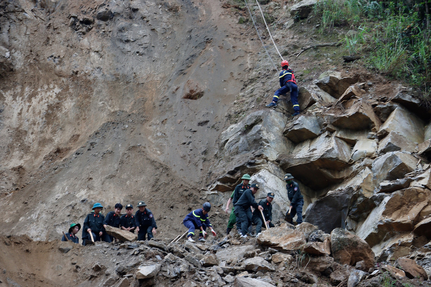 | Khoảng 150 cán bộ, chiến sĩ thuộc Công an tỉnh Lai Châu, Bộ Chỉ huy quân sự tỉnh Lai Châu và công nhân đã được huy động đến hiện trường. |