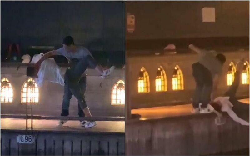 Theo đoạn clip, thanh niên mặc áo phông tay ngắn dùng tay đánh, đấm vào mặt, vào đầu của thanh niên mặc áo sơ mi trắng. Lúc này, nạn nhân đang vắt vẻo trên thành cầu trong tư thế nằm ngang, hai tay hai chân cố bám lấy thành cầu để leo lên. Sau đó, thanh niên áo phông tay ngắn cố dùng sức đẩy nạn nhân xuống, thậm chí, dùng chân đạp vào người nạn nhân đến bất tỉnh rồi hất xuống sông.