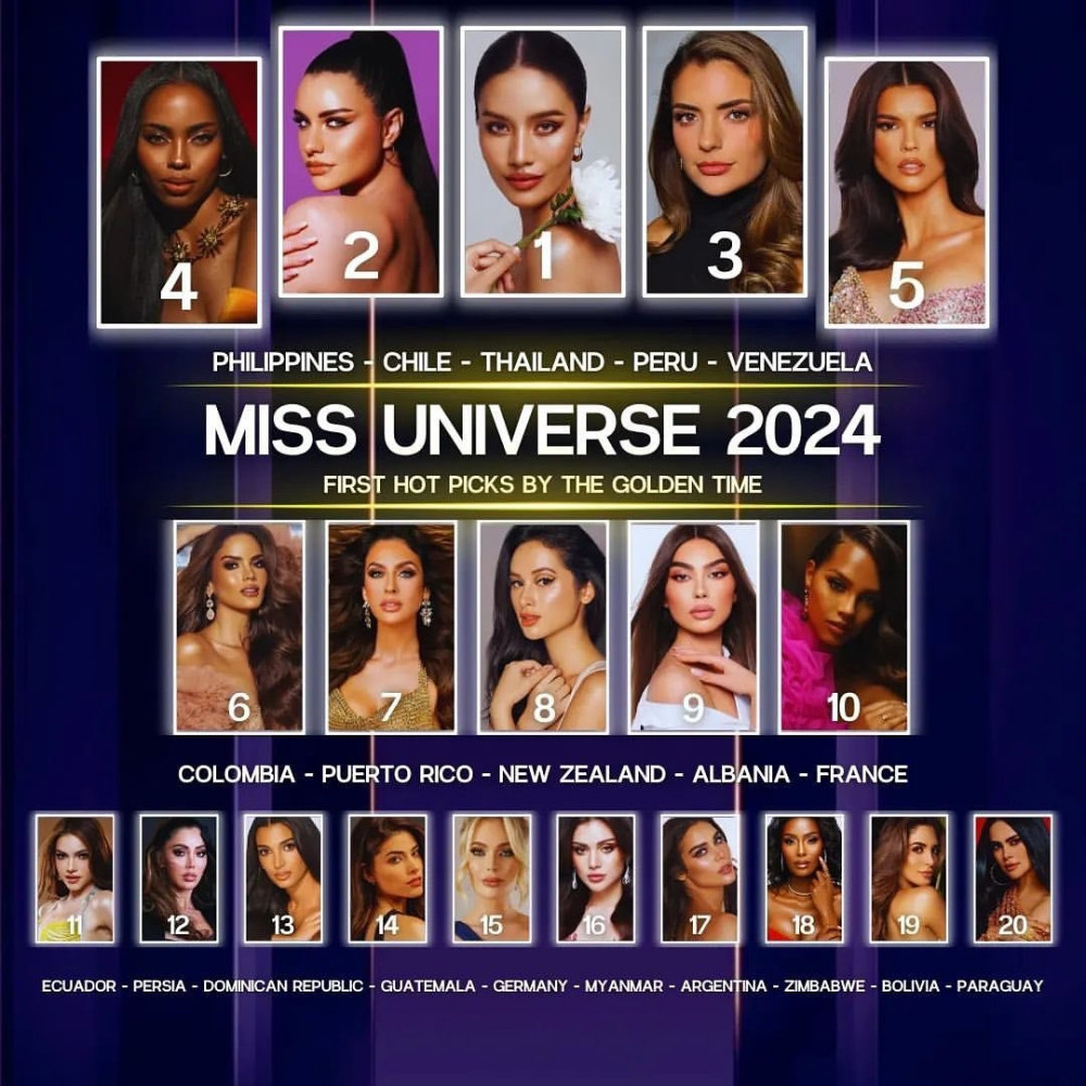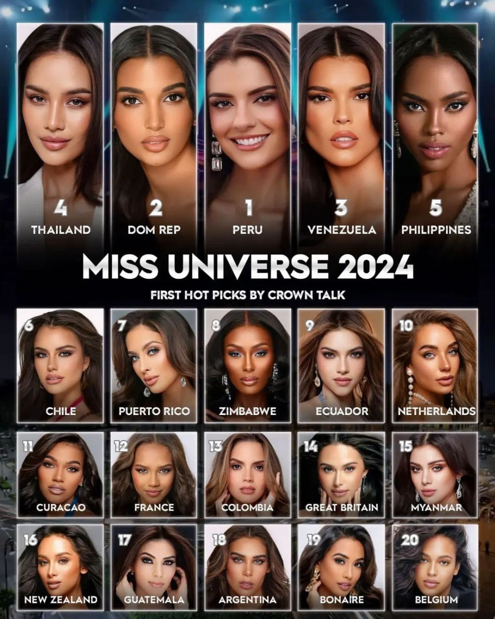 Ngoài đại diện Thái Lan, các người đẹp đến từ Venezuela, Peru, Cộng hoà Dominican, Puerto Rico, Philippines... cũng được dự đoán sẽ là những thí sinh nổi bật trong cuộc đua giành vương miện Hoa hậu Hoàn vũ 2024.
