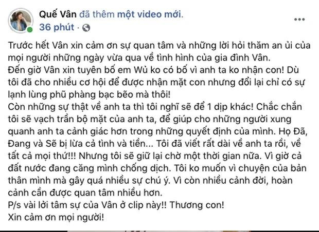 Quế Vân đau khổ tiết lộ “Ngày hôm qua là ngày cuối cùng của sự việc. Vân nhận được thông tin từ bố em Wủ, bố em nói đây không phải con của anh ấy. Câu nói này là sự xúc phạm đối với Vân". Cô còn chia sẻ thêm “Bố con từ chối con, mẹ sẽ không phải thử ADN. Mẹ không muốn đưa thông tin này lên mạng xã hội. Nhưng mẹ cay đắng quá khi bố không nhận con".