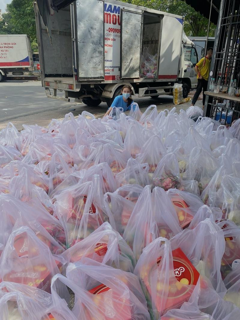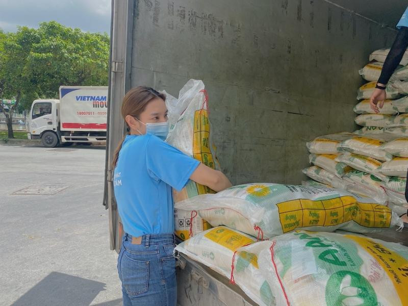 Đồng thời, người đẹp còn ủng hộ 5 tấn gạo cùng 1000 phần quà cho những người dân tại phường Tân Hưng, Q.7, TP.HCM. Mỗi phần quà gồm 5kg gạo, bánh kẹo, rau củ quả và một số thực phẩm thiết yếu khác.