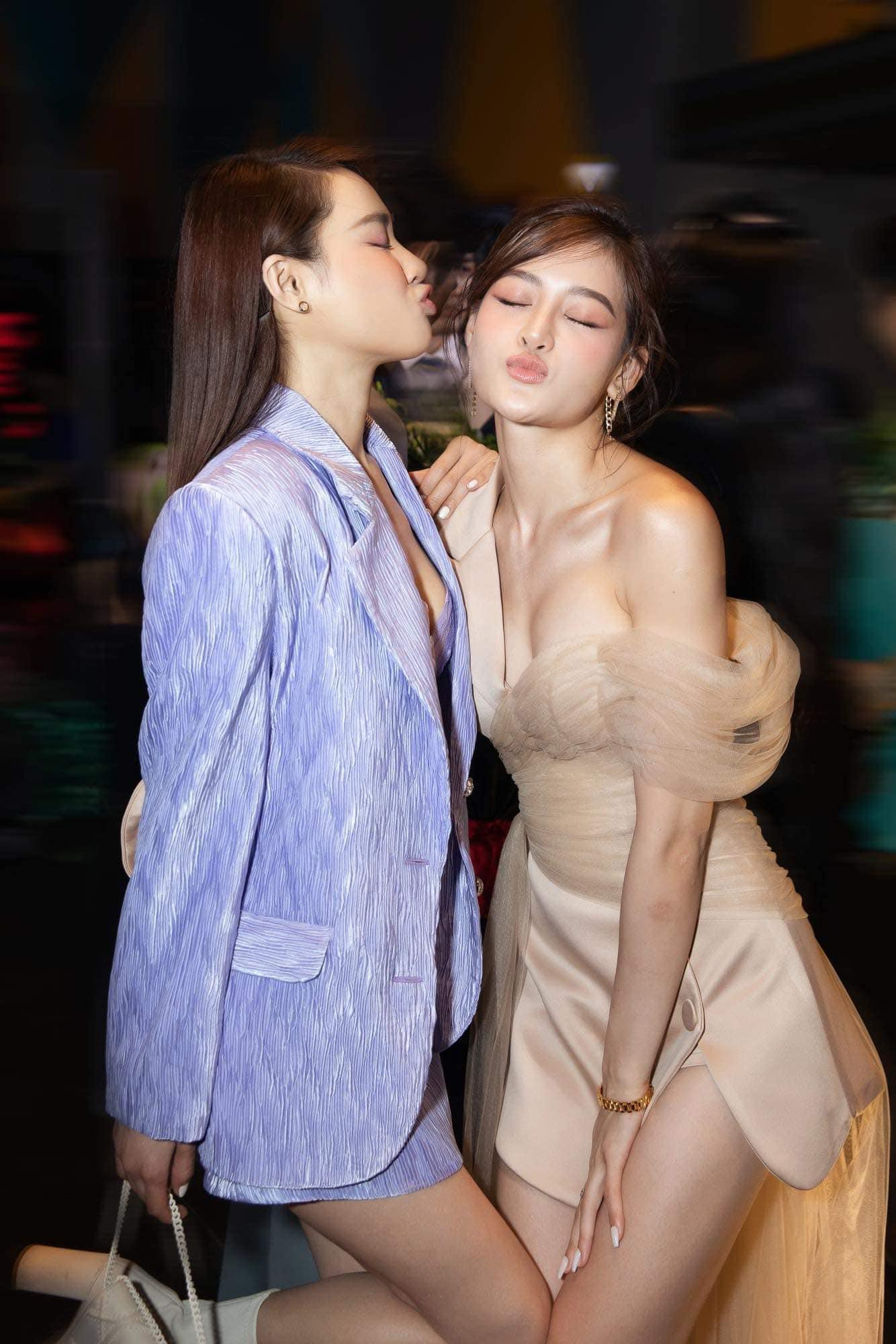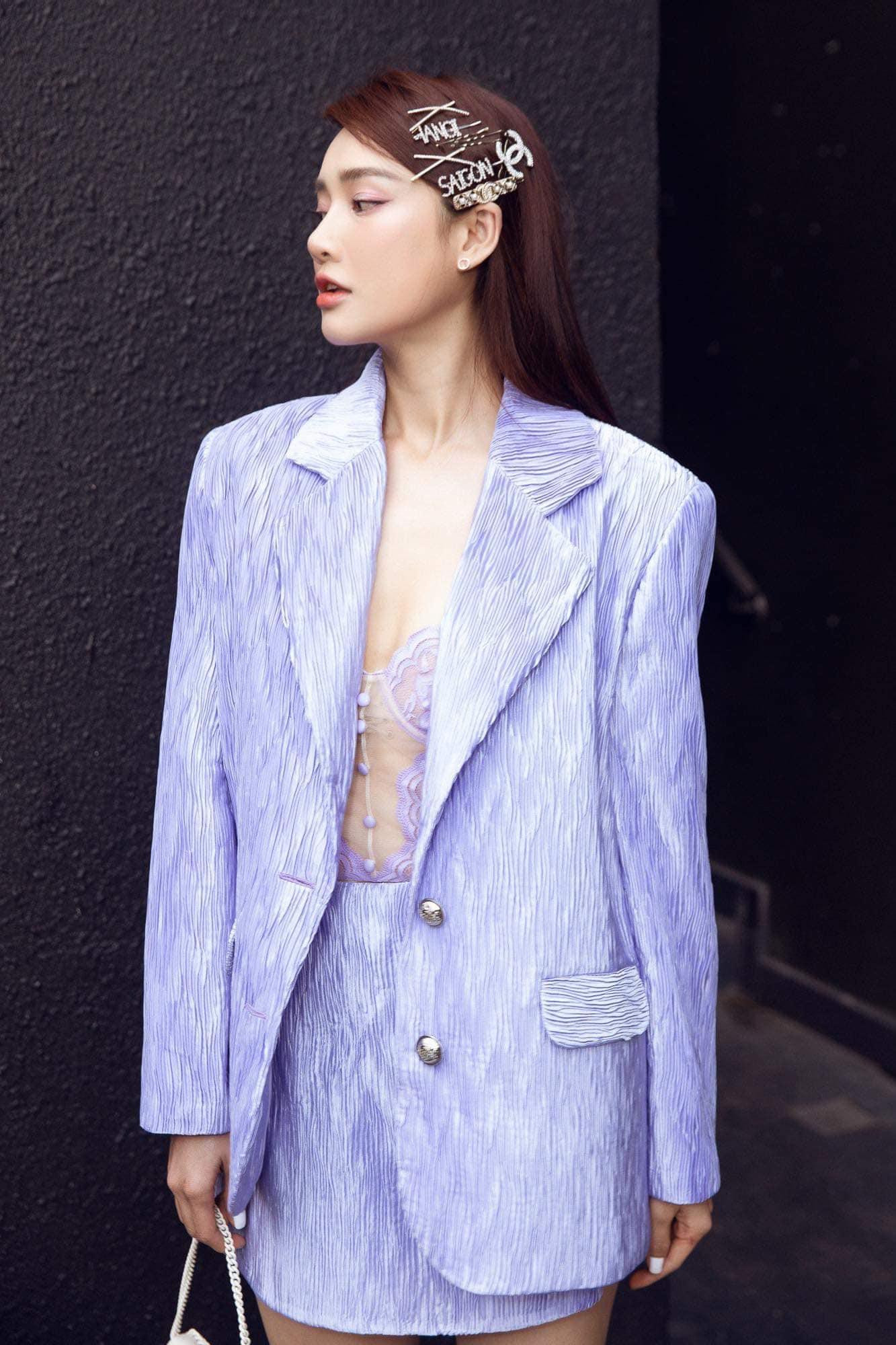Bộ váy áo màu tím nhạt đúng xu hướng năm 2022 đã giúp Nhã Phương giấu được cánh tay và xương ức có phần quá gầy gò của mình. Nhã Phương kết hợp blazer khoác ngoài với áo ren bên trong đầy táo bạo và mới lạ so với phong cách thường thấy của nữ diễn viên.