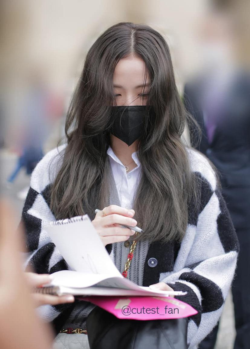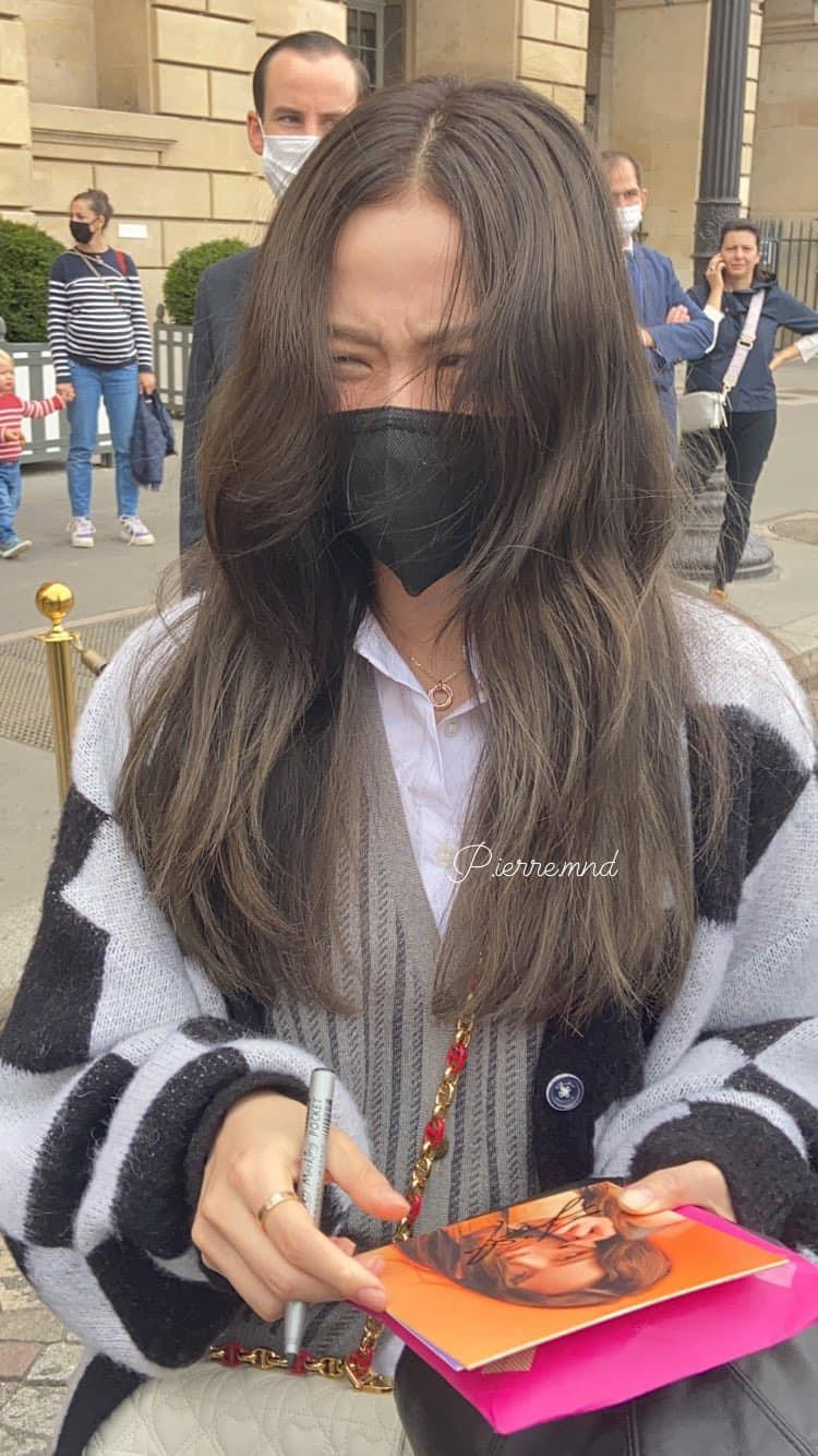Trong một lần lộ diện khác cũng tại Paris, những bức hình chụp gần cho thấy Jisoo sở hữu màu tóc pha trộn giữa xám và nâu nhưng chắc chắn không phải tóc đen sẫm màu.