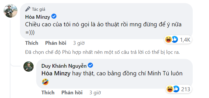 Trước những bình luận của khán giả bởi sự "là lạ" này, nữ ca sĩ hài hước đáp trả: "Chiều cao của tôi nó gọi là ảo thuật rồi, mọi người đừng để ý nữa". Ngay sau đó, tình đồng đội "có chắc bền lâu" của Duy Khánh - Hòa Minzy nhanh chóng "lung lay" khi nam diễn viên trêu chọc: "Hòa Minzy hay thật, cao bằng đồng chí Minh Tú luôn".