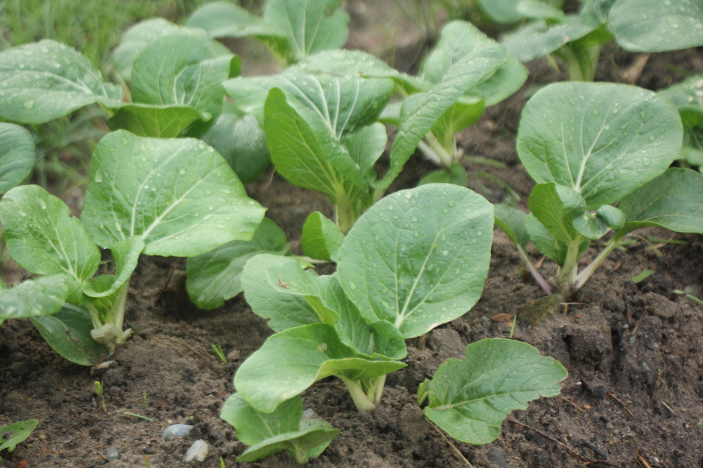 | Đức Thắng bên các luống rau vừa gieo trồng. |
