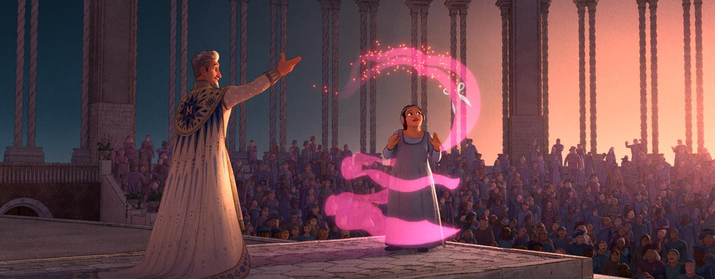 Phim Wish mở đầu với hình ảnh cuốn truyện cổ tích mở ra cùng lời dẫn truyện của Asha để giới thiệu bối cảnh và nguồn gốc của Vương quốc Rosas. Cảnh phim gợi nhắc tới những tác phẩm kinh điển như Bạch Tuyết (1937), Lọ Lem (1950) và Công Chúa Ngủ Trong Rừng (1959).