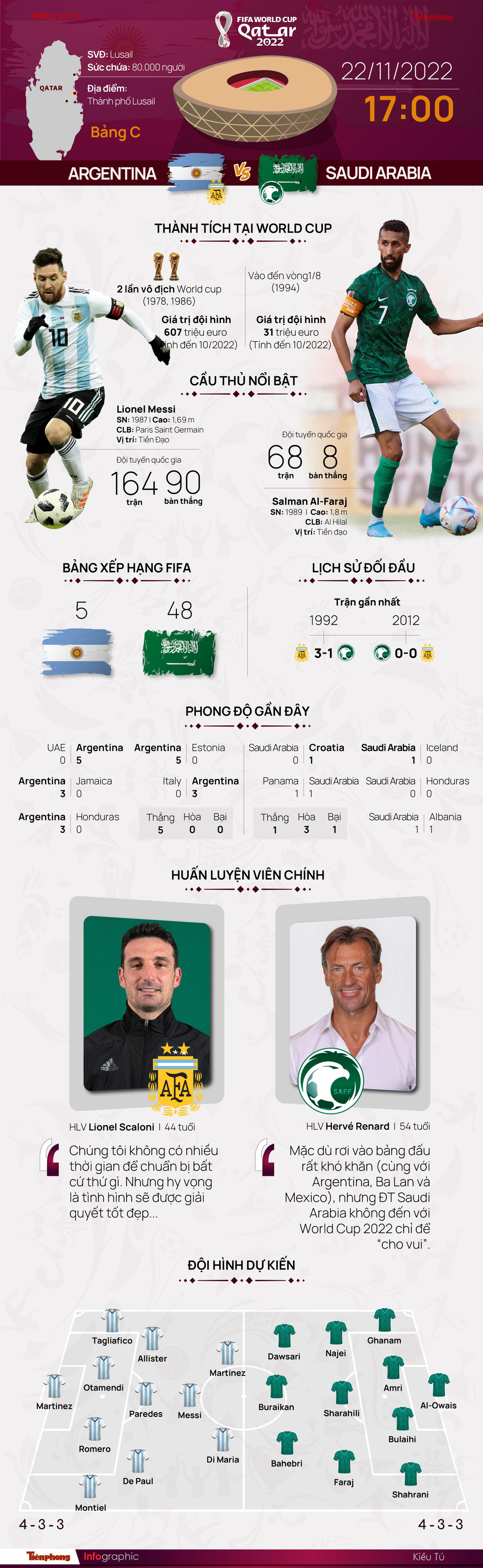 TPO - Argentina chắc chắn sẽ tập trung giành chiến thắng trong trận mở màn World Cup của bảng C. Cơ hội để Saudi Arabia có điểm là vô cùng thấp. Messi đang có phong độ rất cao và đầy quyết tâm không chỉ vượt qua vòng bảng mà còn là chức vô địch World Cup.