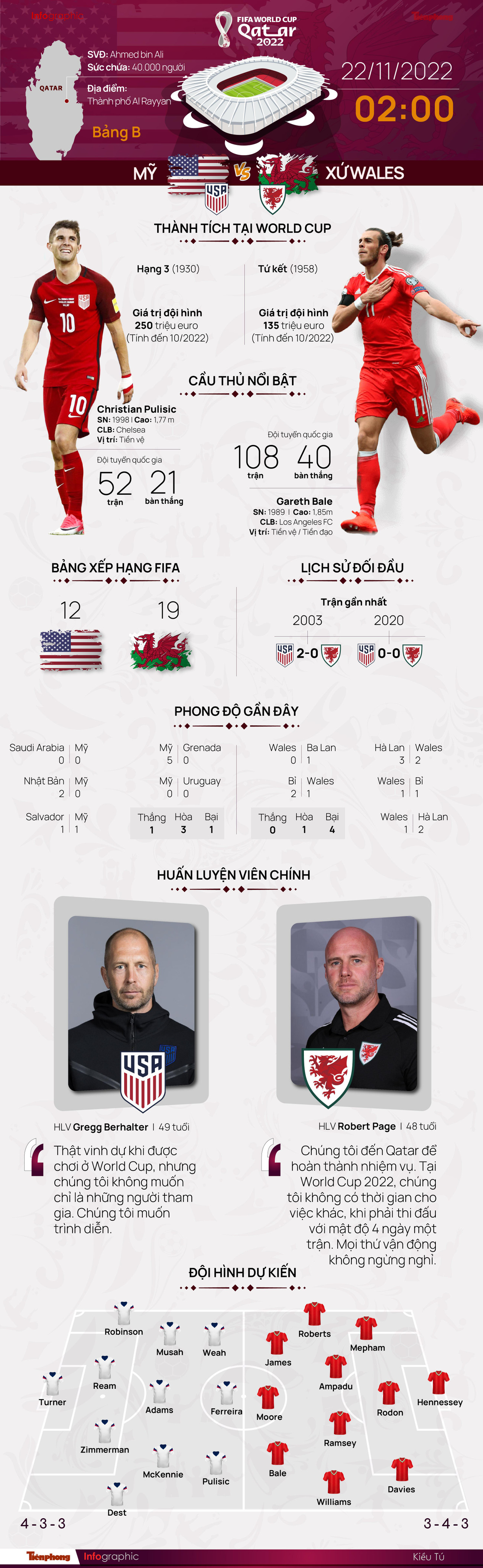 World Cup 2022: Tương quan trận đấu Mỹ - Xứ Wales, 2 giờ 22/11
