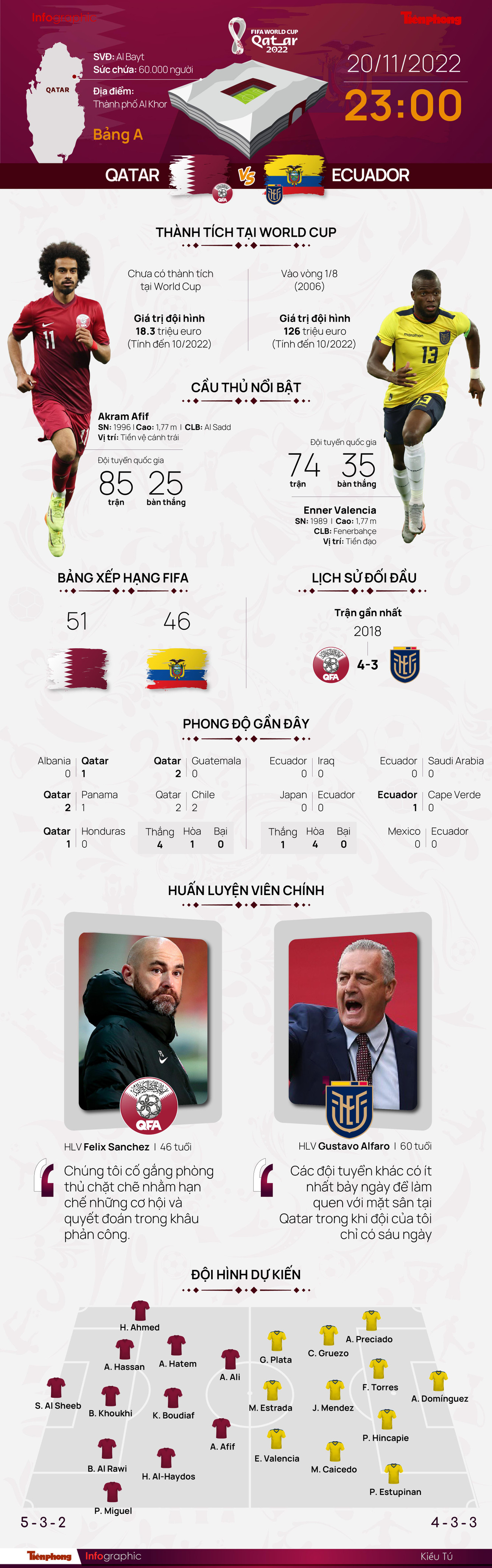 TPO - Trong trận đấu khai mạc giải bóng đá World Cup đội chủ nhà Qatar sẽ có trận mở màn với đội tuyển Ecuador. Đây sẽ là trận đấu quan trọng với cả hai khi mà ở bảng A vẫn còn đó những ông lớn như là Hà Lan và Senegal. Qatar sẽ hướng đến 1 chiến thắng để khẳng định họ xứng đáng là chủ nhà ngày hội bóng đá lớn nhất hành tinh.