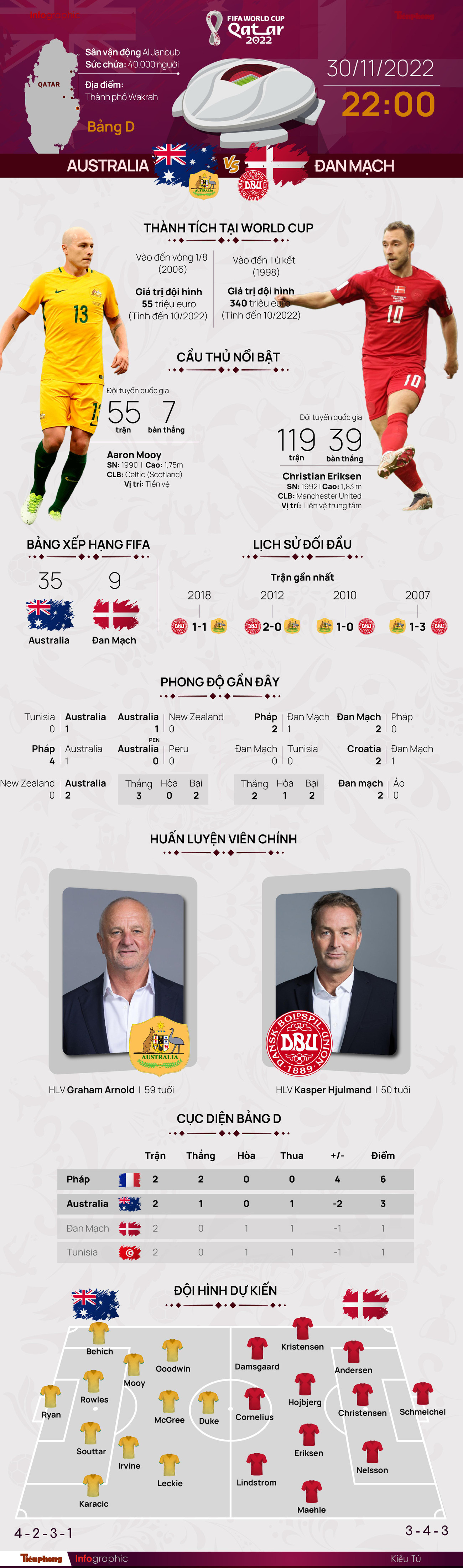 TPO - Australia sẽ có màn đối đầu với Đan Mạch ở lượt trận cuối bảng D World Cup 2022. Đây sẽ là trận đấu quyết định tới cơ hội đi tiếp của hai đội, nên cả Đan Mạch lẫn Australia phải chơi hết mình để hi vọng giành chiến thắng cũng như tấm vé còn lại của bảng D.