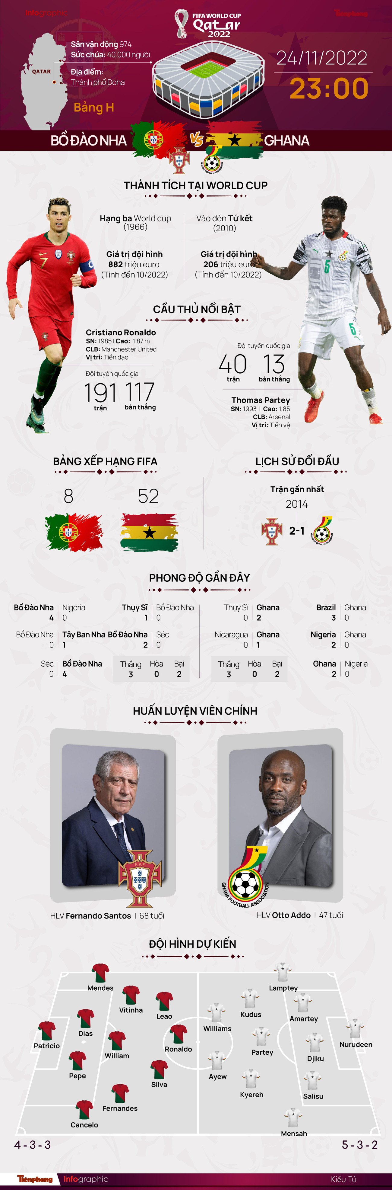 TPO - Trận đấu thứ 2 bảng H là cuộc đối đầu giữa Bồ Đào Nha - Ghana. Hi vọng việc chia tay Man United sau những lùm xùm sẽ không làm ảnh hưởng đến tâm lý của Cristiano Ronaldo. Phía bên kia chiến tuyến, các cầu thủ Ghana tiến đến vòng chung kết World Cup 2022 với quyết tâm rất cao, khi vượt qua đối thủ Nigeria ở loạt trận play-off.