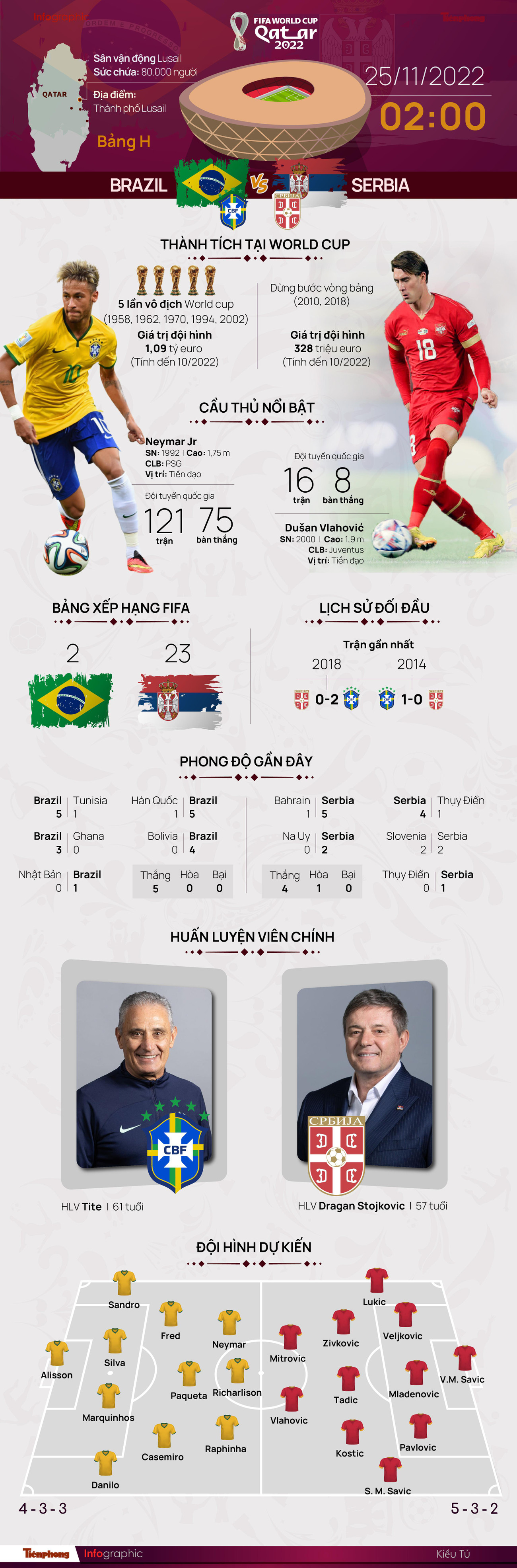 TPO - Trận đấu thứ 2 của bảng H là cuộc đối đầu giữa Brazil - Serbia. Neymar cùng các đồng đội đã có một chiến dịch vòng loại World Cup 2022 khu vực Nam Mỹ vô cùng hoàn hảo với thành tích bất bại. Nhưng với bộ đôi tiền đạo mà cả châu Âu theo đuổi là Mitrovic và Vhalovic cùng những ngôi sao kỳ cựu, Serbia sẵn sàng tiếp mọi đối thủ tại World Cup.