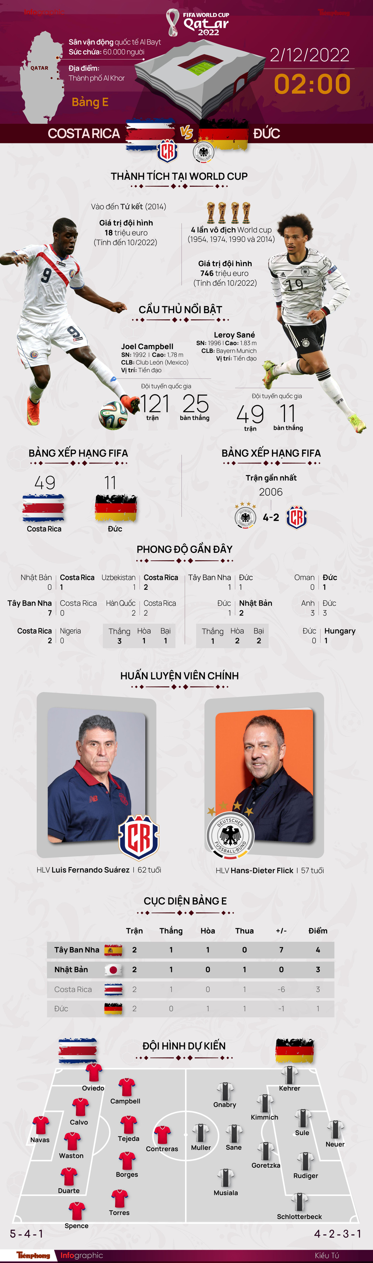 TPO - Trận đấu Costa Rica - Đức tại lượt cuối bảng E World Cup 2022 diễn ra lúc 2 giờ, ngày 2/12. Do đã thua trong ngày ra quân và để hòa với Tây Ban Nha ở lượt trận 2, “Cỗ xe tăng” rơi vào thế buộc phải hạ Costa Rica, giành trọn vẹn 3 điểm để nuôi hi vọng đi tiếp.