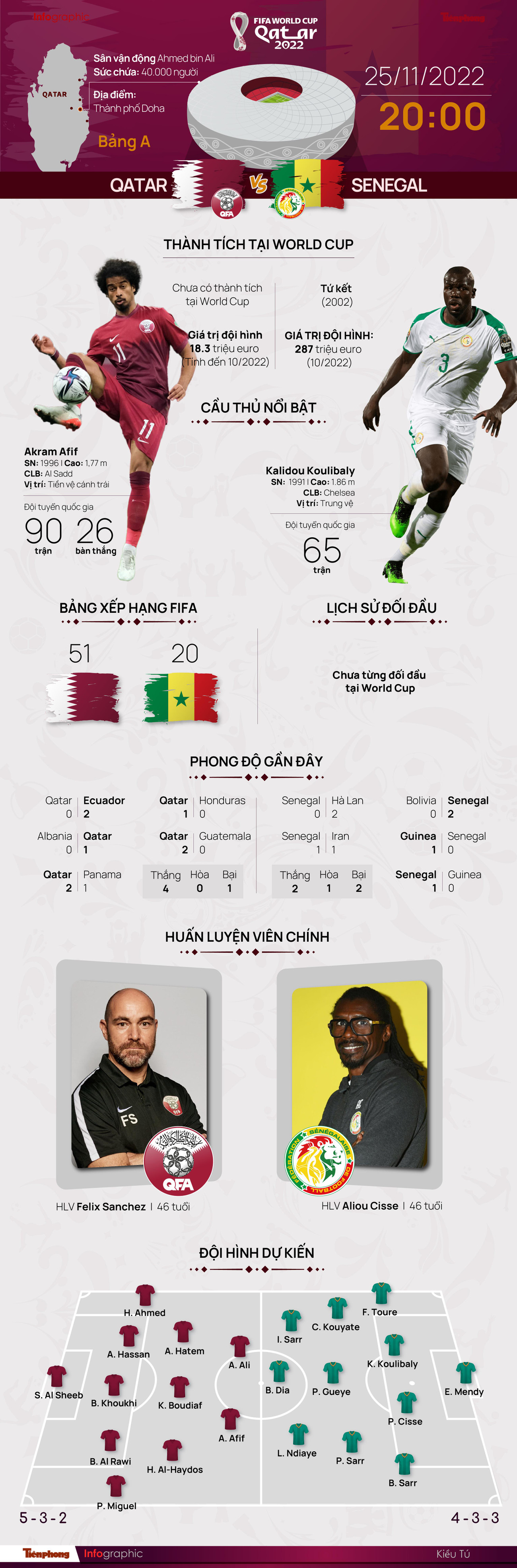 TPO - Ở lượt trận thứ 2 bảng A đội chủ nhà Qatar sẽ gặp một đối thủ rất mạnh là tuyển Senegal. Qatar cần phải vực dậy tinh thần sau trận thua đau Ecuador trong ngày khai mạc World Cup 2022.
