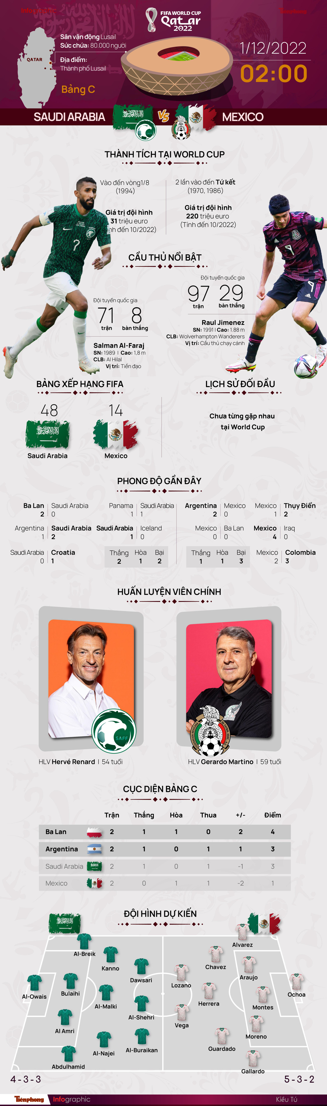 TPO - Saudi Arabia và Mexico sẽ đối đầu nhau ở lượt trận cuối bảng C World Cup 2022. Là hai cái tên được đánh giá sẽ khó có khả năng bước vào vòng trong. Nhưng nếu 1 trong 2 đội giành được 3 điểm ở trận này, họ hoàn toàn có thể nuôi hi vọng tiến vào vòng trong.