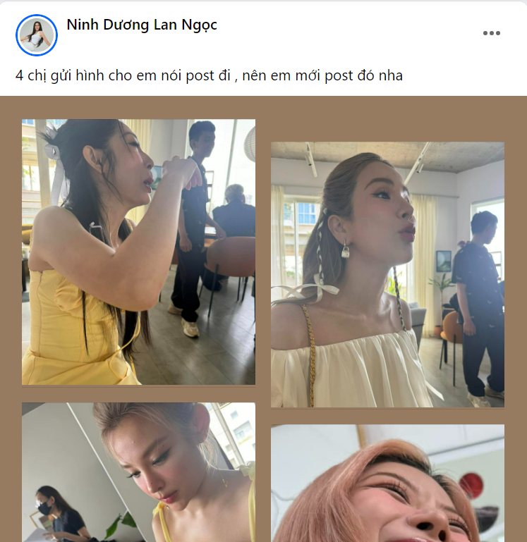 Trong bài đăng, Ninh Dương Lan Ngọc còn nhắn nhủ thêm: "4 chị gửi hình cho em nói post đi, nên em mới post đó nha". Để tránh sứt mẻ tình chị em, nữ diễn viên cũng tự đăng hình dìm bản thân. Tuy nhiên, hình ảnh của Lan Ngọc được hội chị em đánh giá là "có dìm nhưng không đáng kể".