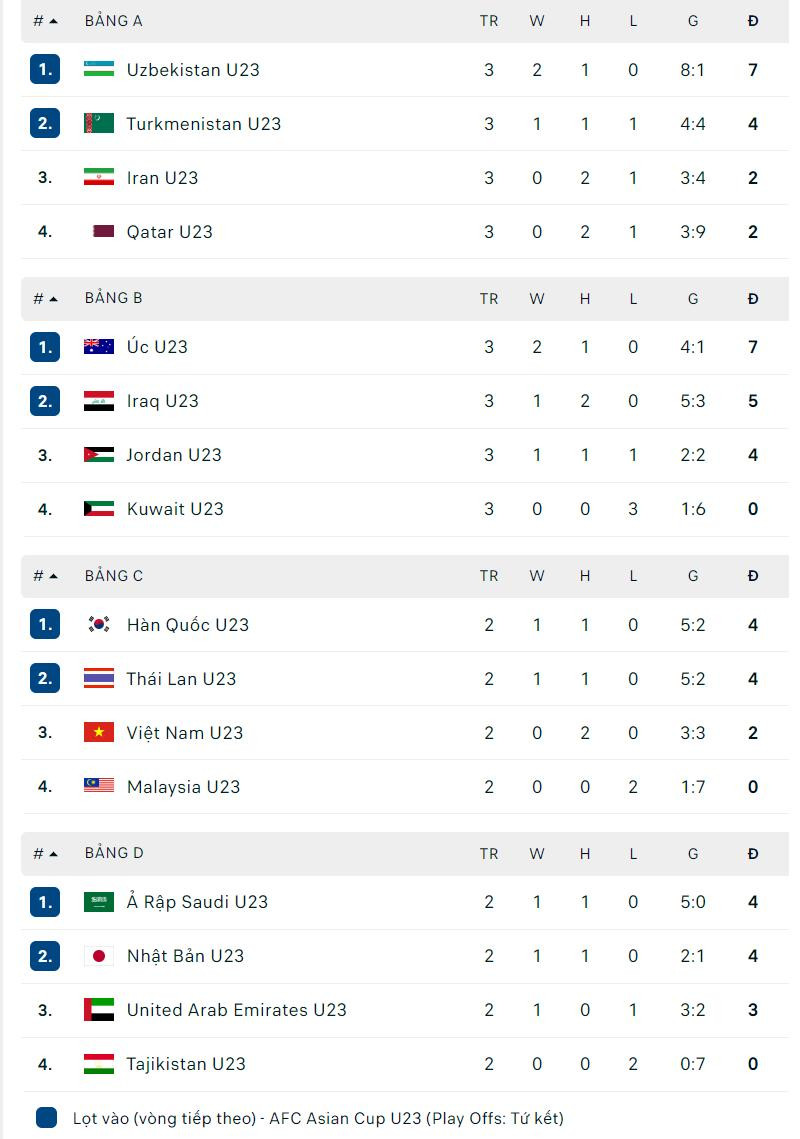 Bảng xếp hạng U23 châu Á mới nhất hôm nay