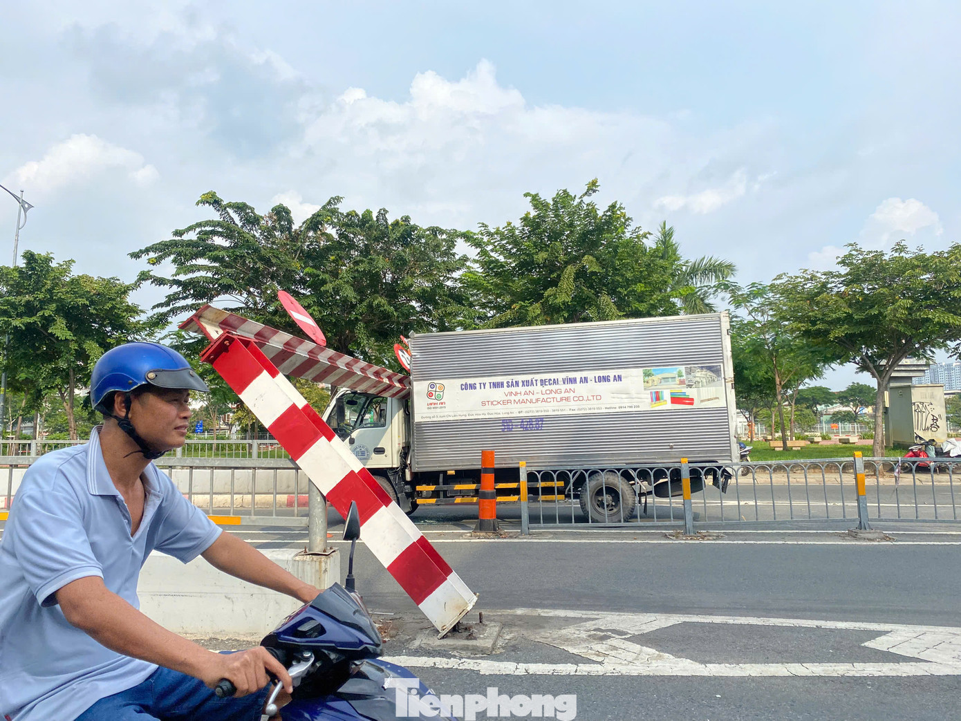 | Vụ va chạm khiến thanh giới hạn chiều cao trước hầm chui cầu Phạm Văn Chí bị đổ nghiêng. Ảnh: Hữu Huy |