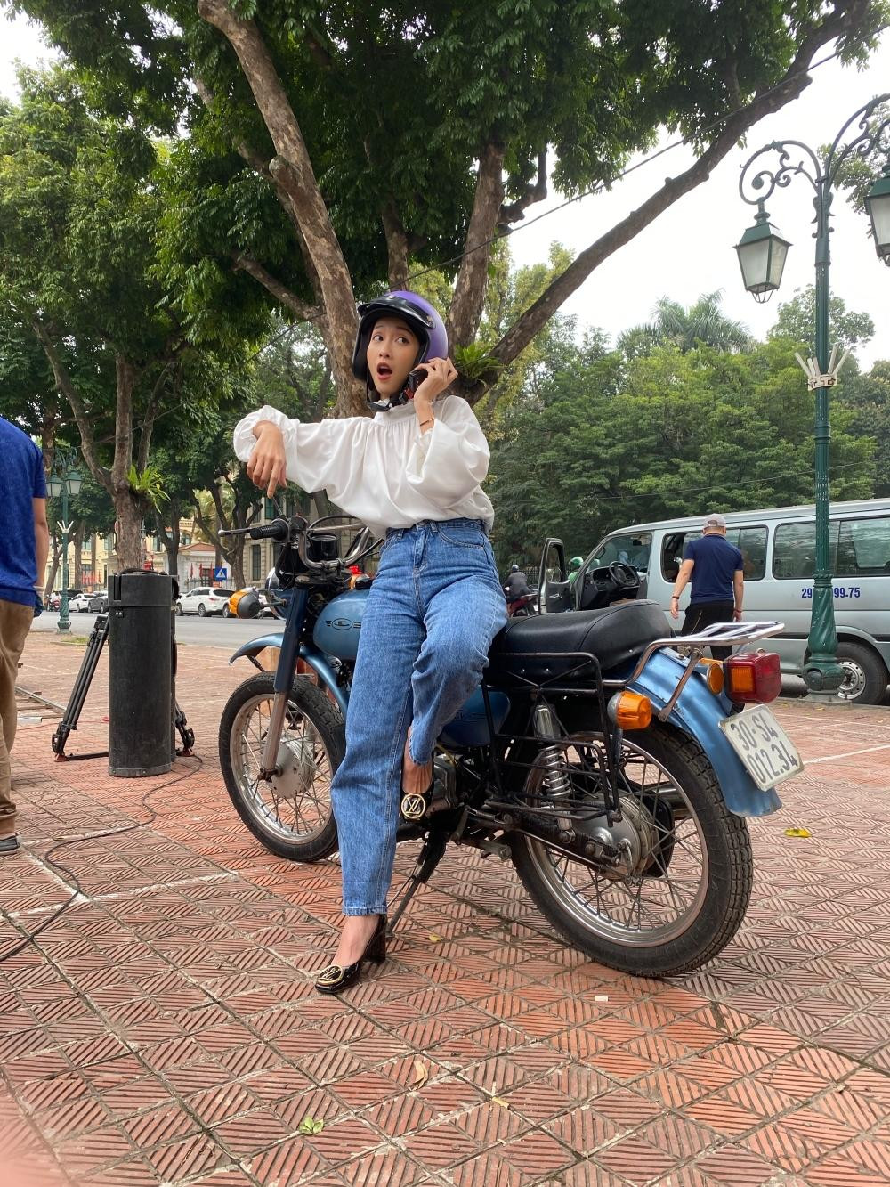 Ngoài kho áo sơ mi trắng thì Khả Ngân còn phối quần jeans xanh và áo thun trắng. Set đồ mang phong cách tối giản nhưng lại giúp nữ diễn viên khoe được vẻ trẻ trung rạng rỡ.