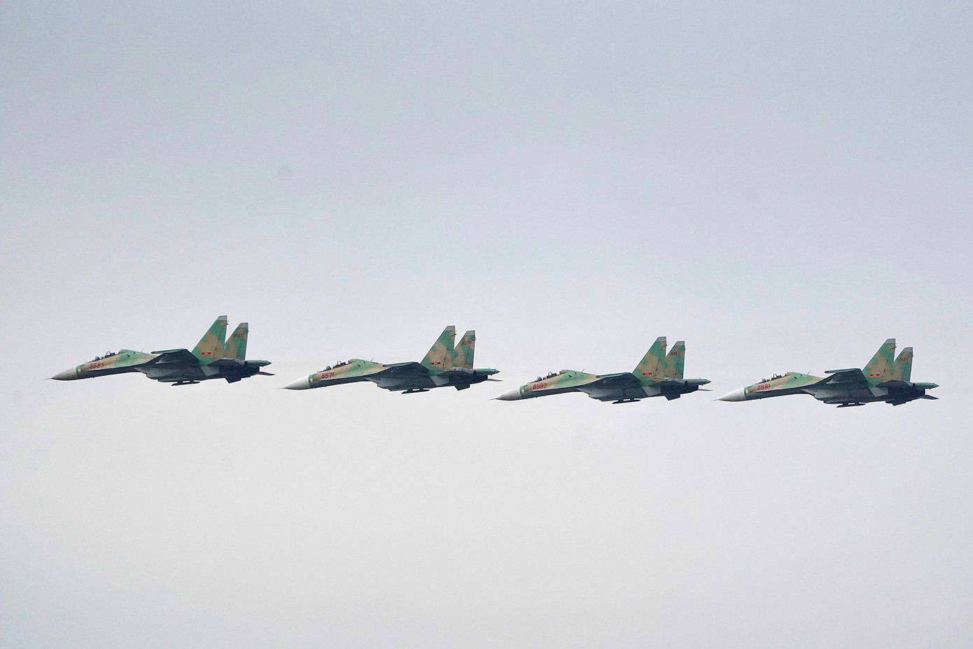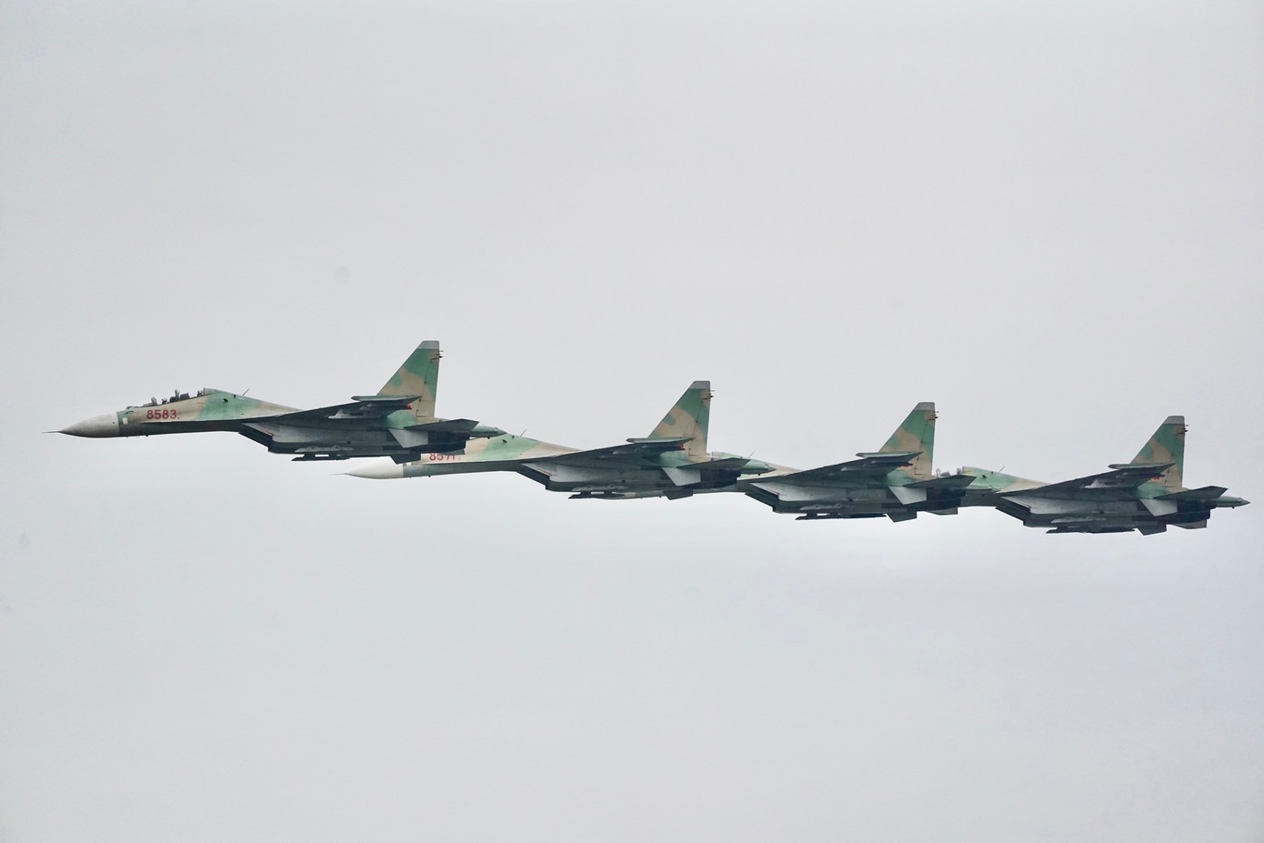 | Để chuẩn bị trình diễn tại lễ khai mạc Triển lãm Quốc phòng quốc tế Việt Nam 2024, chiều 27/11, các biên đội máy bay chiến đấu Su-30MK2 và trực thăng Mi đã thục luyện bay trên khu vực sân bay Gia Lâm (Hà Nội). |