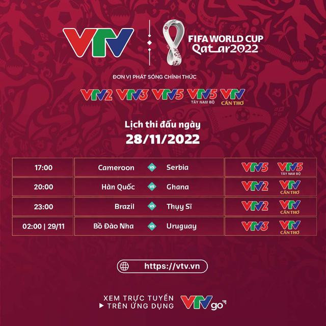 Trận đấu giữa Bồ Đào Nha và Uruguay sẽ được VTV tường thuật trực tiếp trên VTV3 và VTV Cần Thơ vào lúc 02h00 ngày 29/11, bao gồm chương trình bình luận trước, giữa và sau trận.