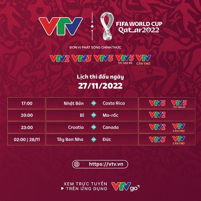 Trận đấu giữa Croatia vs Canada được VTV trực tiếp trên hai kênh VTV Cần Thơ và VTV2, bắt đầu từ lúc 23h00. Trước, giữa và sau trận đấu, VTV sẽ có chương trình đồng hành cùng World Cup 2022.