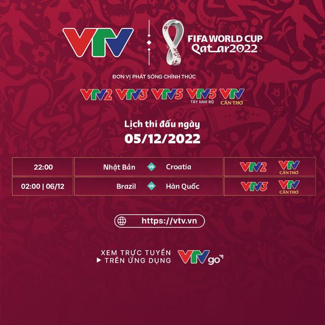 Trận đấu giữa Nhật Bản vs Croatia diễn ra lúc 22h00 ngày 5/12 được VTV tường thuật trực tiếp trên kênh VTV2 và VTV Cần Thơ cũng như ứng dụng VTVGo. Ngoài ra, khán giả có thể xem trực tuyến các kênh sóng này miễn phí thông qua ứng dụng TV360 của Viettel.