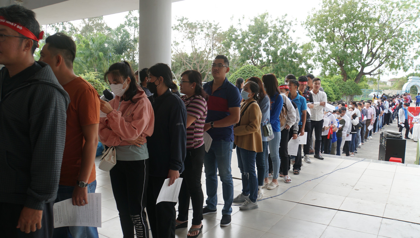 | Các đoàn viên thanh niên Kiên Giang kiên nhẫn xếp hàng đăng ký hiến máu |