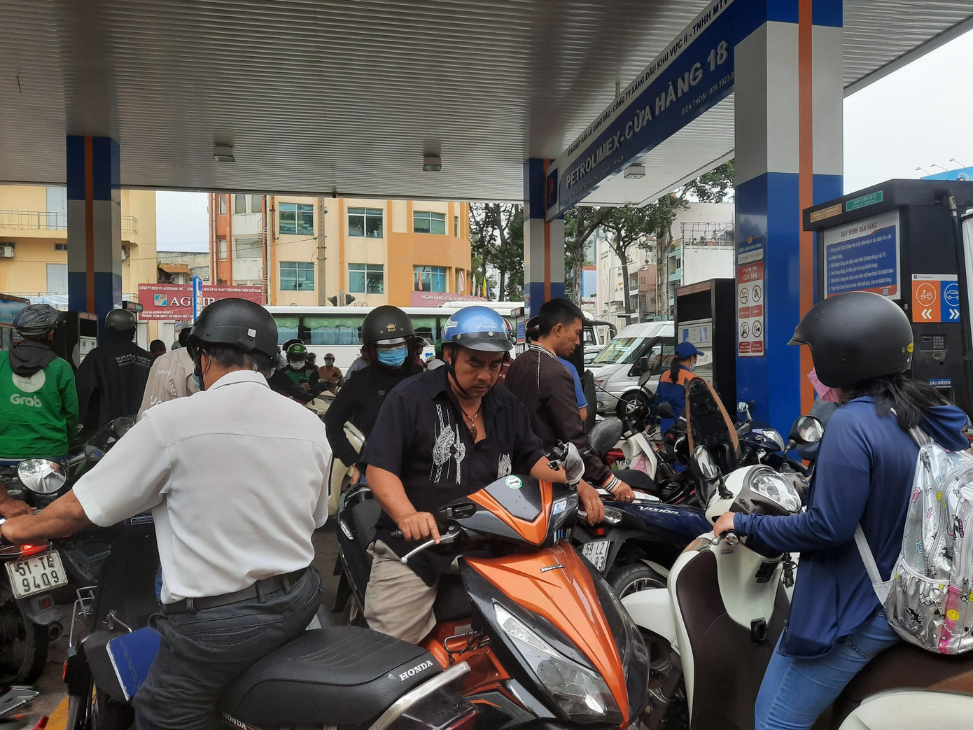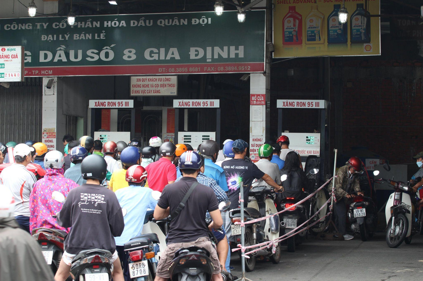 | Tại Cửa hàng xăng dầu Petrolimex - cửa hàng số 18 (địa chỉ 444 Trần Hưng Đạo, quận 5, TPHCM) khách nườm nượp đến và xếp hàng dài chờ đổ xăng từ sáng sớm. Bà Mai (ngụ quận 8, một trong những người phải xếp hàng chờ đổ xăng) cho biết: "Xe tôi gần như đã cạn xăng, không thể di chuyển qua các điểm khác được nữa, đành phải chờ hơn 15 phút mới đổ được một ít". |
