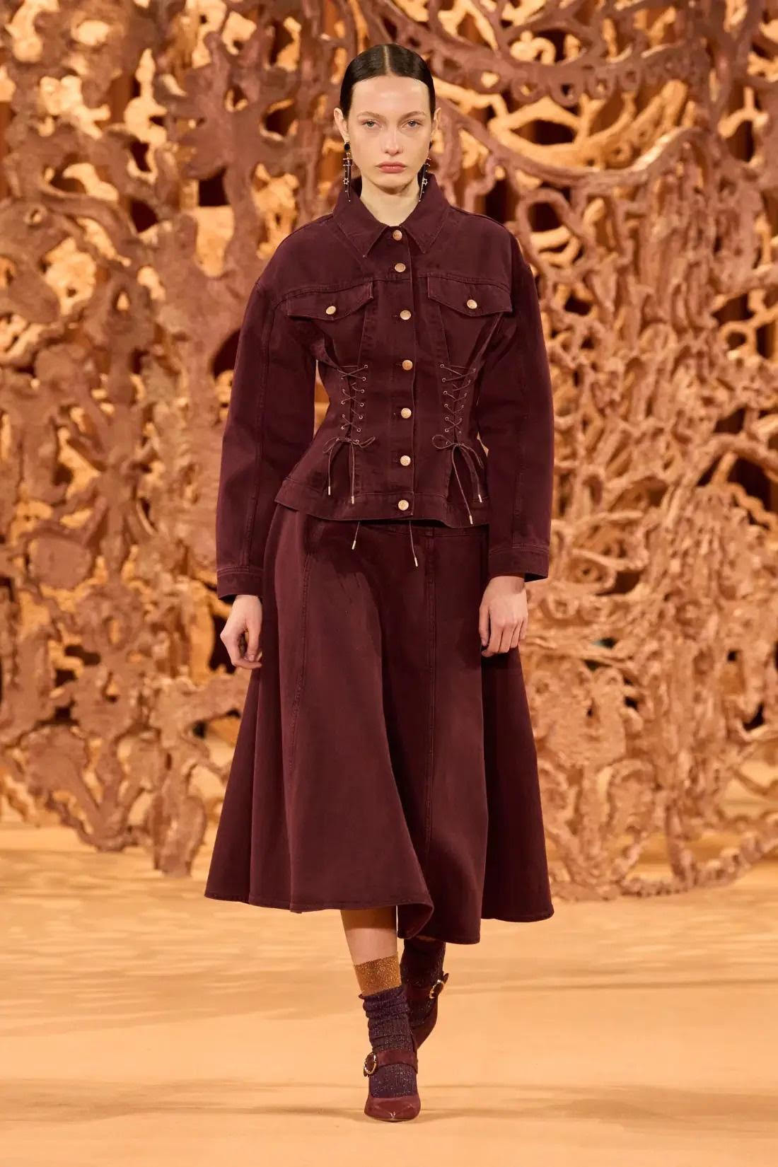 Có thể không phải là sự lựa chọn hàng đầu, nhưng xu hướng denim on denim vẫn là điểm hấp dẫn trong các bộ sưu tập Thu/Đông 2024. Các nhà thiết kế đã kết hợp những bộ tuxedo denim theo cách thú vị hơn, không chỉ dừng lại ở phong cách cổ điển mà còn thêm item denim thứ ba vào để tăng sự độc đáo.