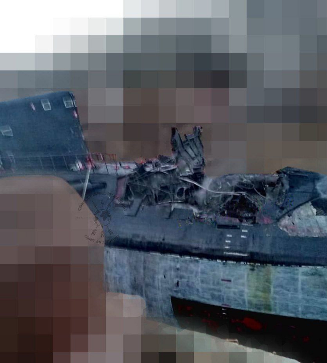 Các hình ảnh được công bố bởi Nhóm Tình báo xung đột (CIT) chuyên phân tích về quân sự, có trụ sở ở Tbilisi (Gruzia), cho thấy con tàu thuộc Hạm đội Biển Đen của Nga bị hư hại đáng kể sau cuộc tấn công của Ukraine.