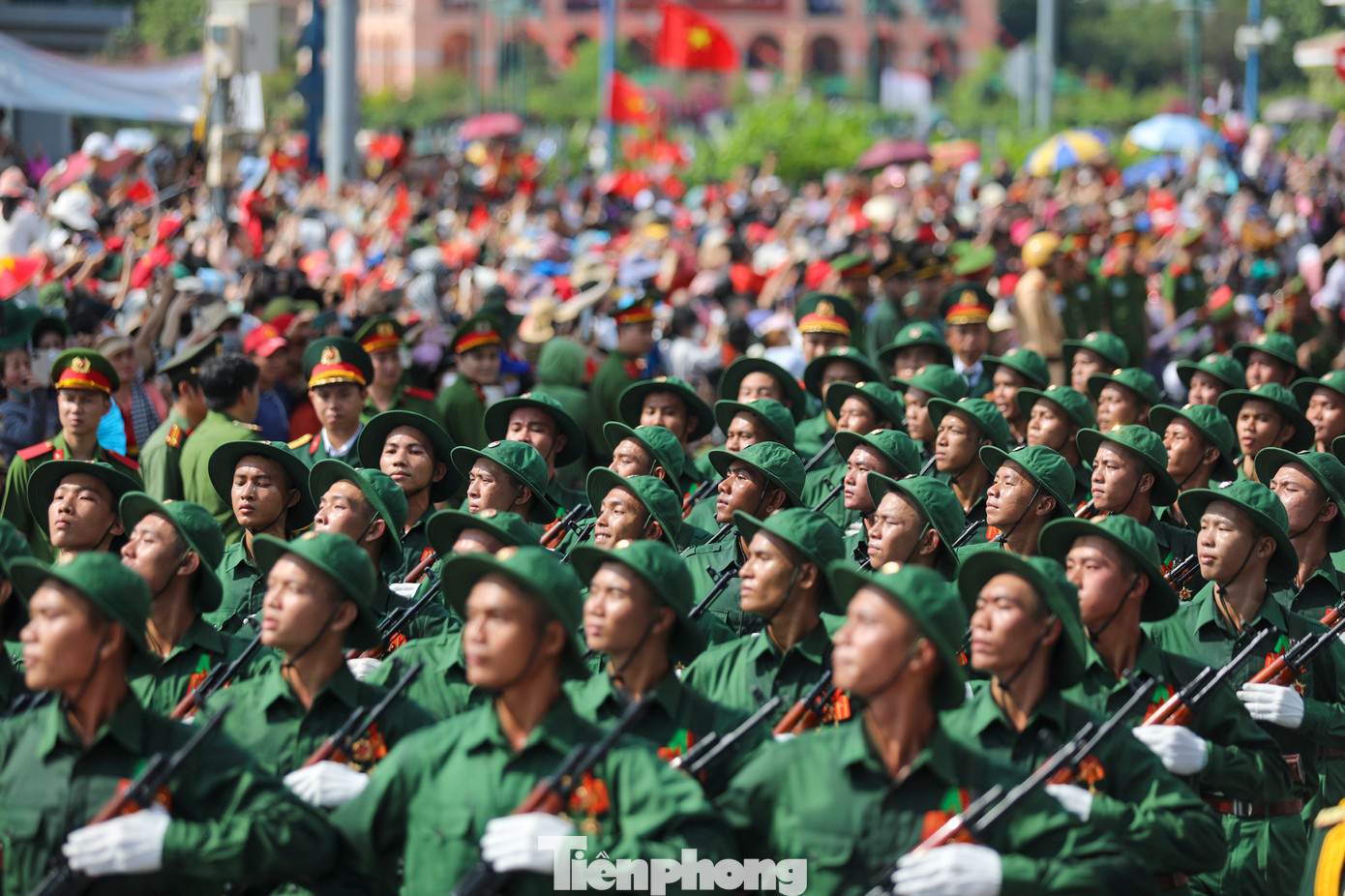 Giữa biển người hân hoan vẫy chào, các khối diễu binh uy nghiêm tiến bước trong niềm tự hào.
