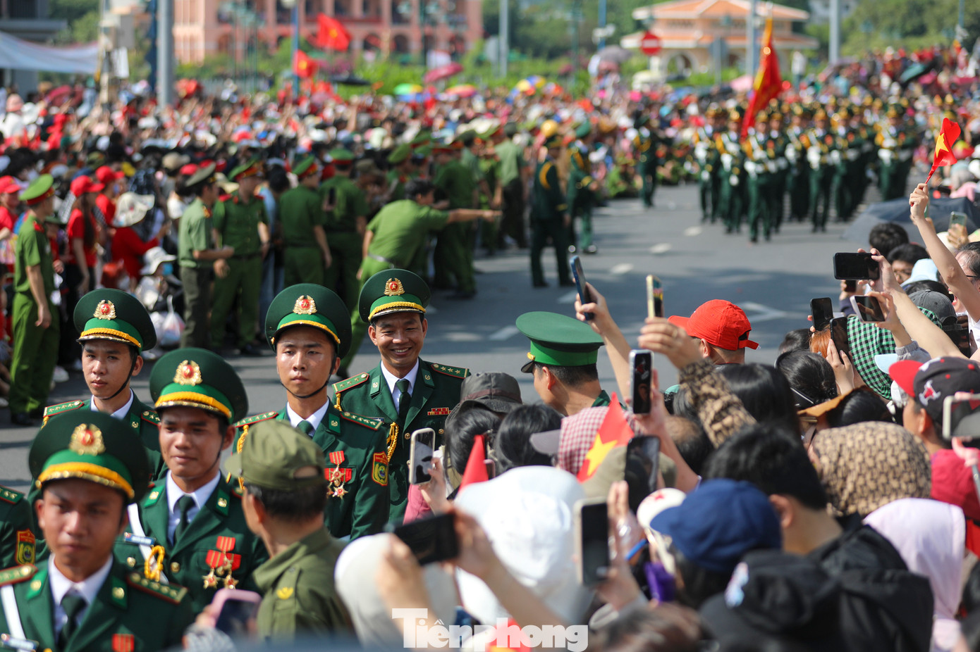 Người dân xếp hàng kín hai bên đường, cùng vẫy cao cờ hoa, hò reo chào đón từng khối diễu binh, diễu hành bước qua.