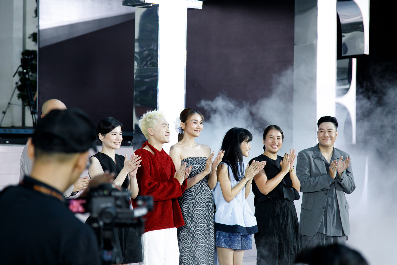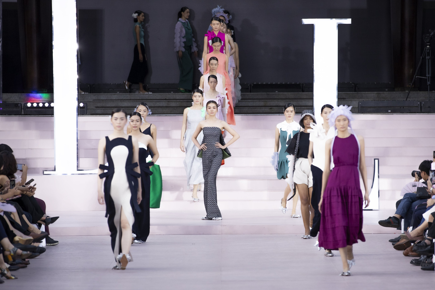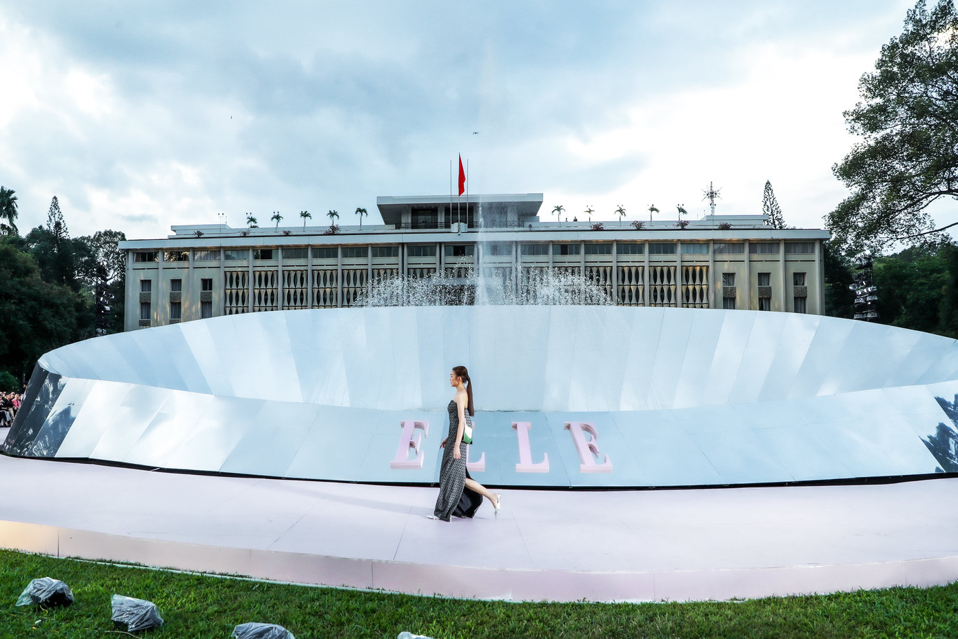 Với gần 1.000 khách tham dự, Thanh Hằng sải bước trên sân khấu hình vòng tròn được phủ màu hồng khói ấm bắt đầu từ sảnh chính của Dinh Độc Lập rồi trải dài quanh khu vực bãi cỏ đến tâm điểm show là biểu tượng hình ê-líp bằng thép và nhôm phản chiếu bao quanh đài phun nước trung tâm.