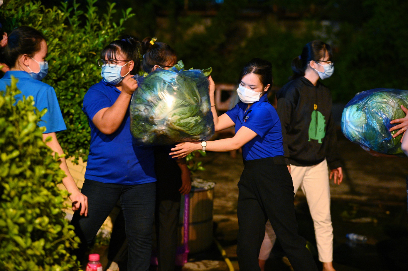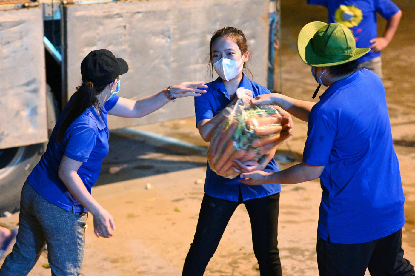 Hình ảnh tình nguyện viên áo xanh thuộc đội phản ứng nhanh phòng chống dịch COVID-19 bốc xếp 18 tấn rau củ hỗ trợ người dân khu cách ly, phong tỏa tại Bình Dương: