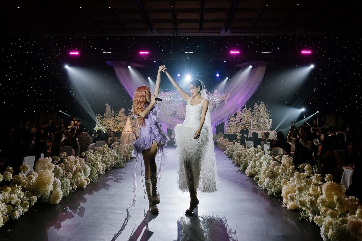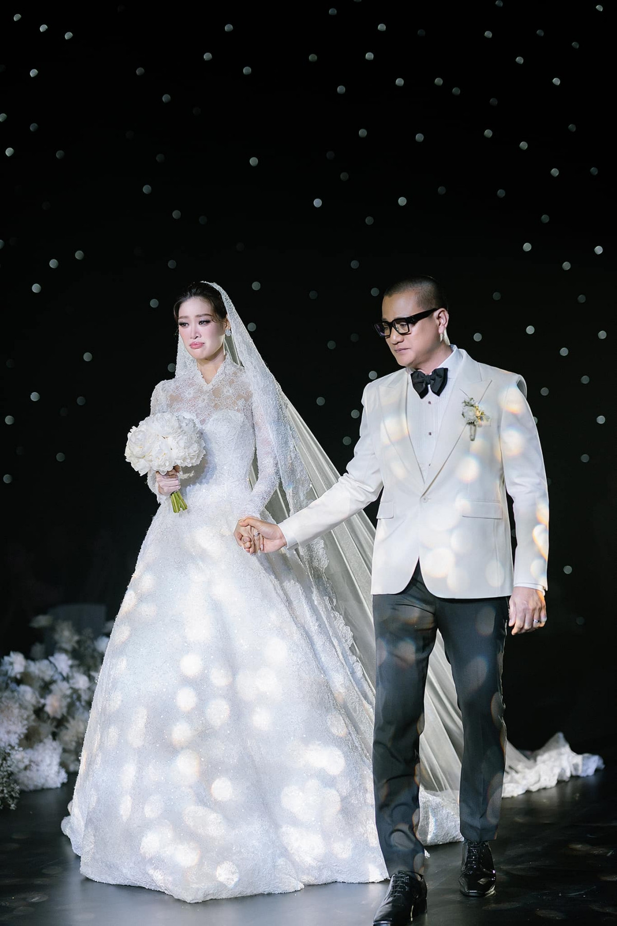 Trong không gian tràn ngập tình yêu, Khánh Vân tiếp tục tỏa sáng trong chiếc váy cưới lấy cảm hứng từ vẻ đẹp thanh tao, mong manh của hoa cánh bướm. Chiếc veil được điểm xuyết bằng hoa cánh bướm đính kết thủ công, như một biểu tượng của tình yêu vĩnh cửu.