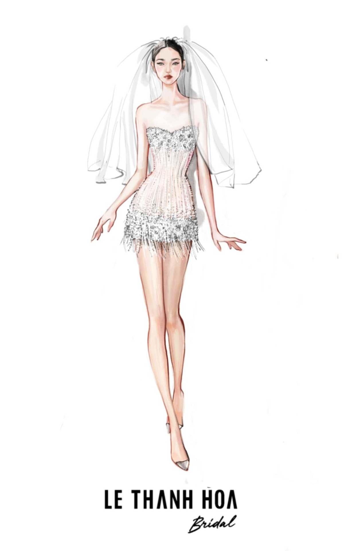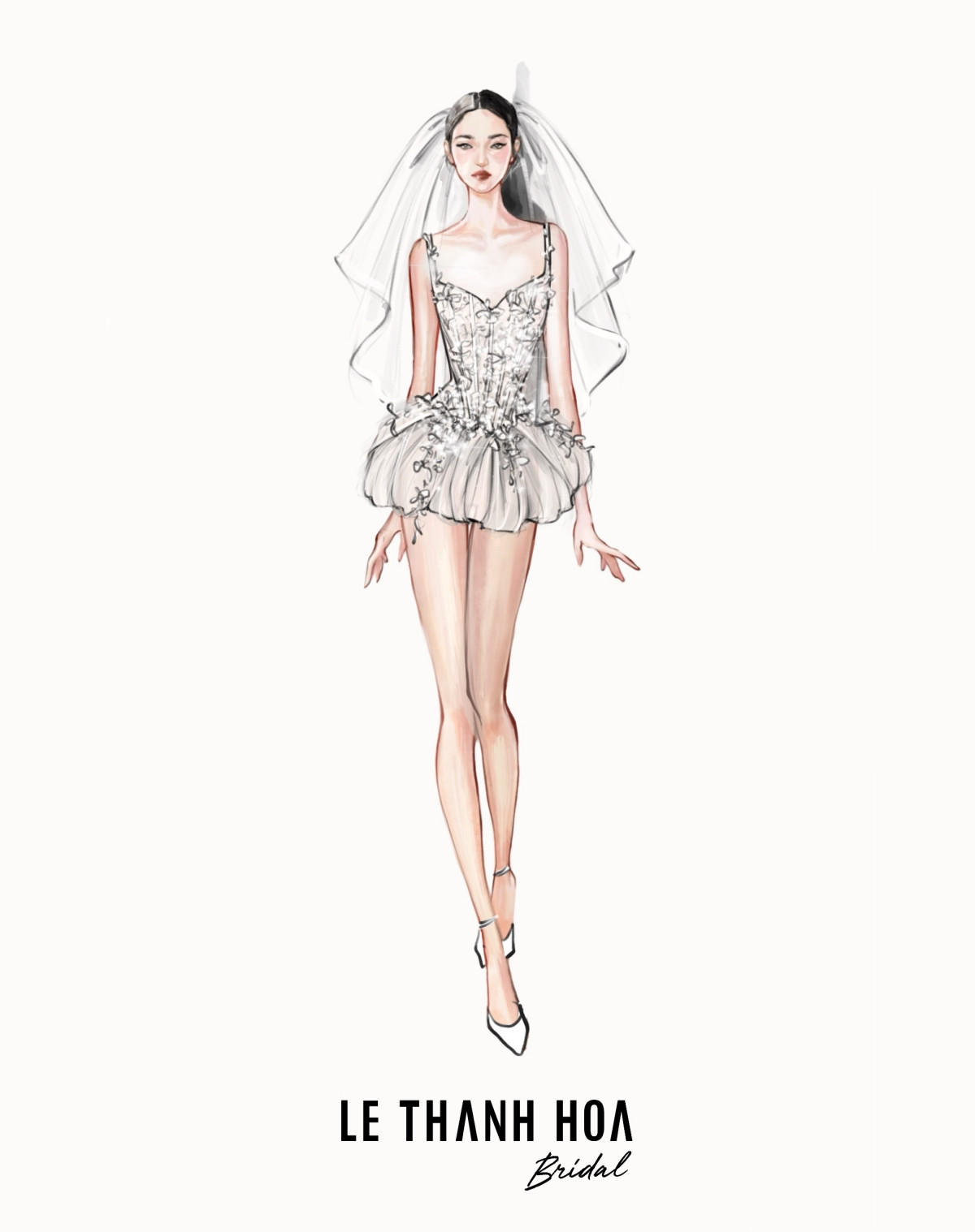 Thiết kế thứ ba mang phong cách trẻ trung và đầy táo bạo. Chiếc váy tea-length với áo cúp ngực hai dây, được nhấn nhá bằng chi tiết pha lê Swarovski thủ công, tạo hiệu ứng lấp lánh.
