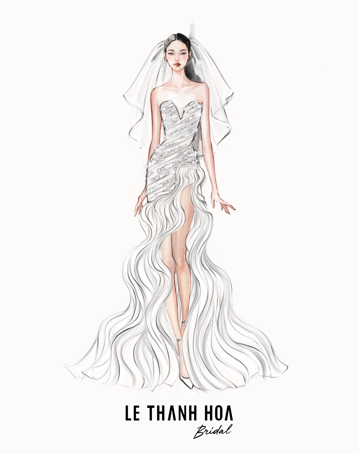 Lấy cảm hứng từ những gợn sóng mềm mại nhưng mạnh mẽ, chiếc váy cưới đầu tiên được Khánh Vân mặc trong hôn lễ tôn vinh vẻ đẹp thuần khiết và lãng mạn. Phần váy xẻ tà cách điệu với những đường gợn sóng uốn lượn nhẹ nhàng, tạo cảm giác như một bản giao hưởng của thiên nhiên.