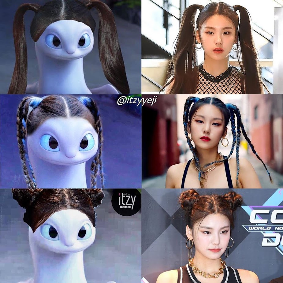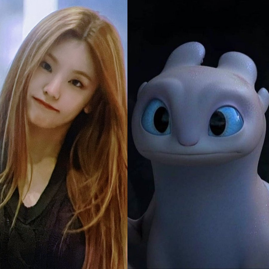 Các fan so sánh gương mặt độc đáo của Yeji với nàng rồng Light Fury và nhận thấy có nhiều điểm tương đồng như đều rất xinh đẹp, mạnh mẽ, sắc sảo, tươi vui... Họ còn thử cho Light Fury mặc trang phục và để các kiểu tóc của Yeji.